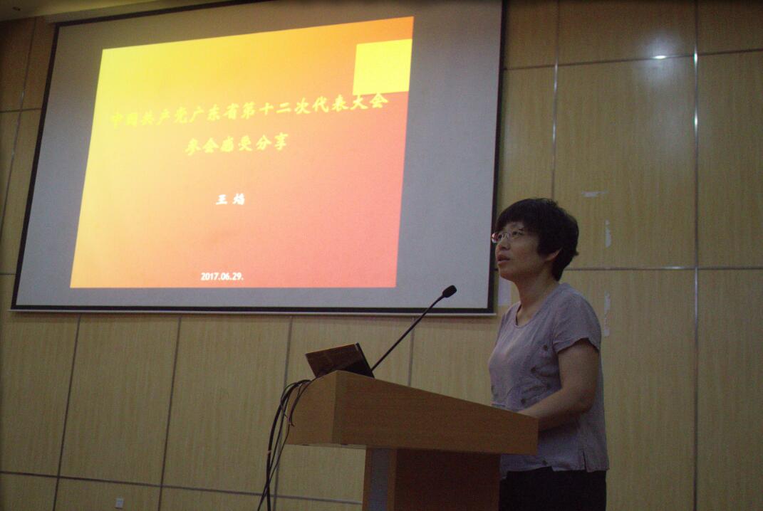 随后,中国共产党广东省第十二次代表大会代表、所党委委员、工会主席、中科院矿物学与成矿学重点实验室主任王焰传达了省第十二次党代会主要精神。她从深入实施创新驱动发展战略和推动全面从严治党向纵深发展等方面进行阐释,并以“敬畏规则、守住底线、不越红线”十二字与大家共勉。