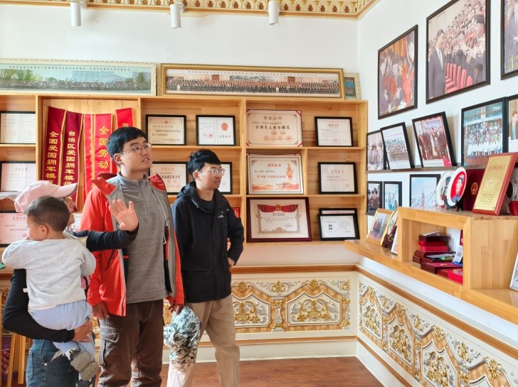 随后,拉齐尼·巴依卡同志的妹妹都来提汗,带领团委青年代表们参观学习了时代楷模拉齐尼·巴依卡同志事迹陈列纪念室,生动地讲述了拉齐尼·巴依卡同志“一家三代心向党”、在红其拉甫边境惊心动魄为国戍边的爱国故事。室内,一幅幅擦拭得锃亮、悬挂整齐的照片,无声诉说着三代人的忠诚足迹。拉齐尼各个时期的英姿则布满了墙壁:从在武警部队服役时从事站岗与训练,到英姿勃发的“帕米尔雄鹰”,特别引人注目的是一个壁龛:珍重陈列着拉齐尼的“时代楷模”勋章、荣誉证书。