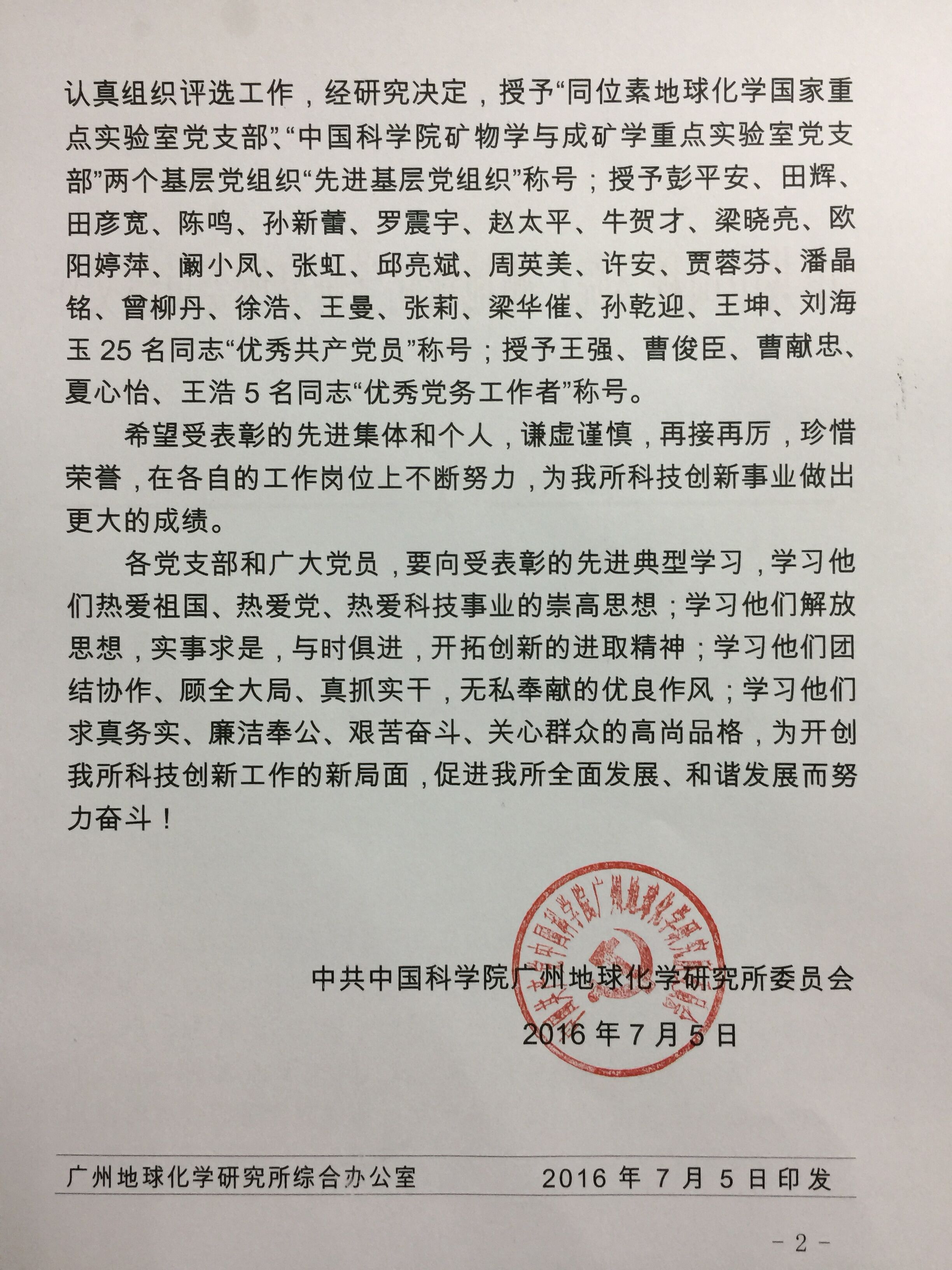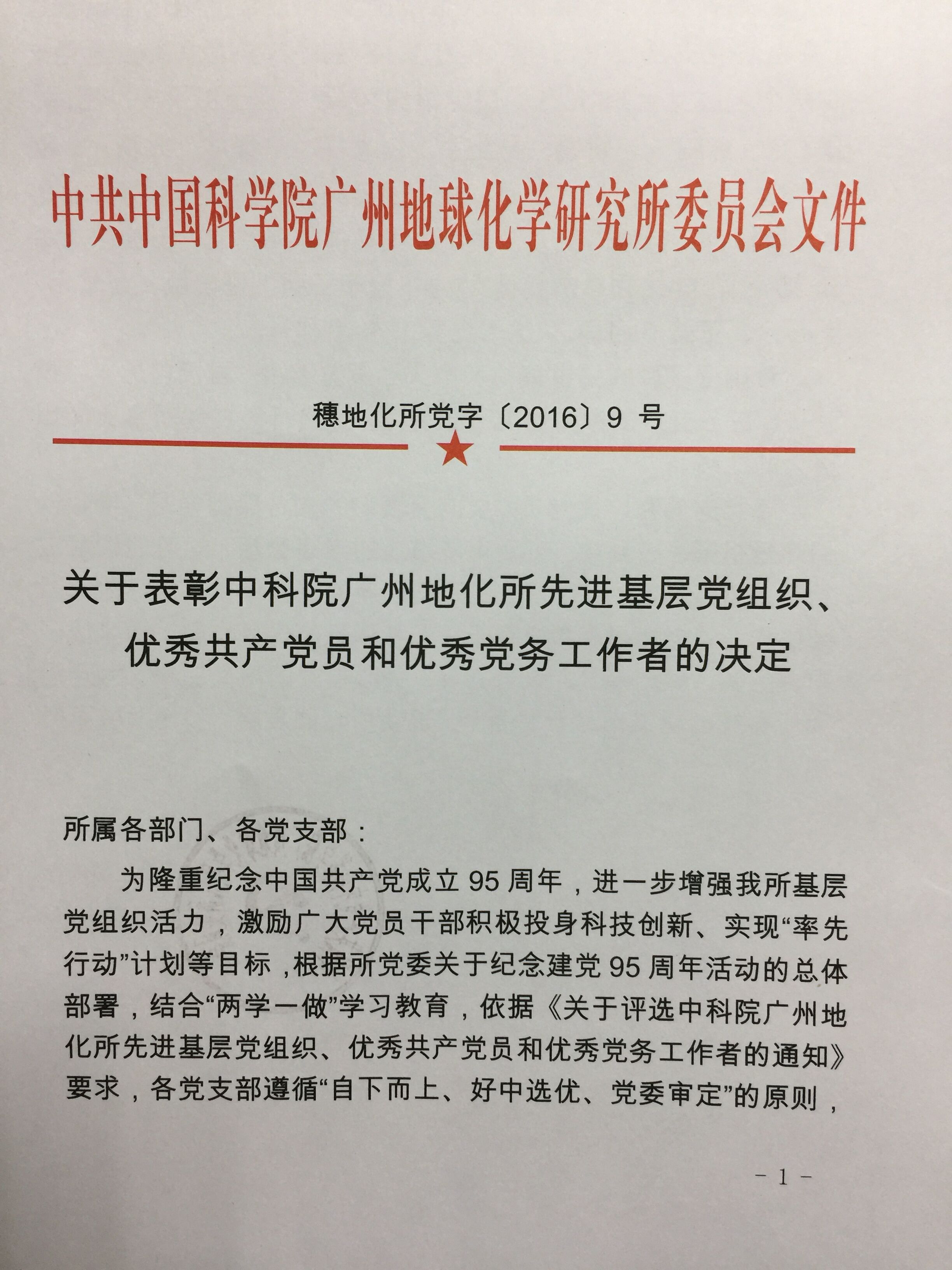 关于表彰中科院广州地化所先进基层党组织、优秀共产党员和优秀党务工作者的决定