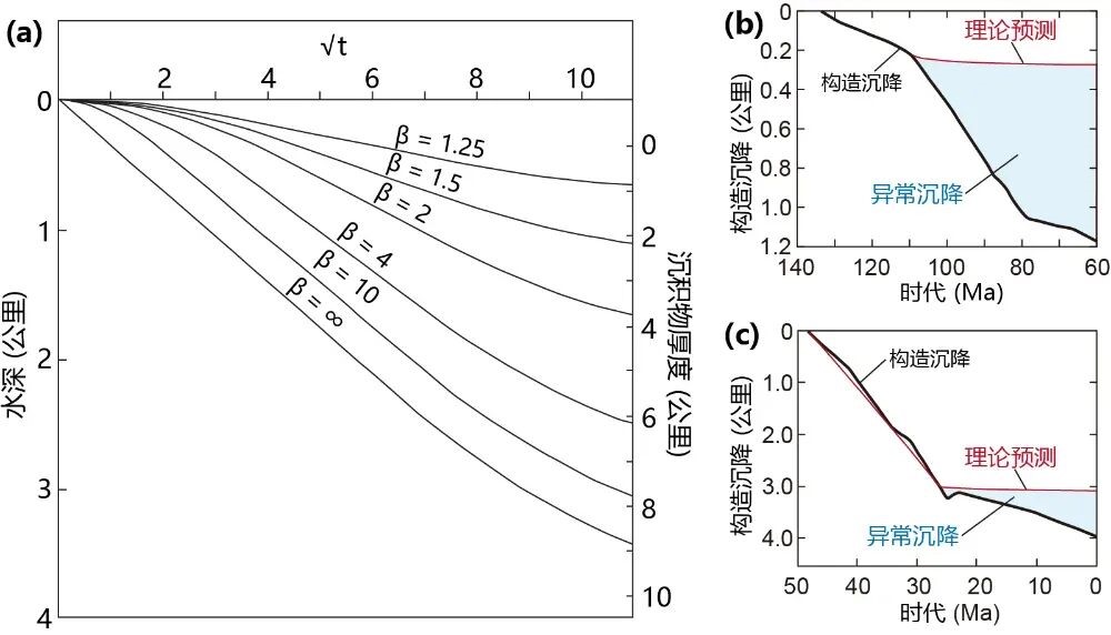 图1. 裂谷盆地沉降过程的理论模型与“非典型”案例。(a)不同伸展量(β)下的理论沉降过程(McKenzie ,1978 ,EPSL)。(b)松辽盆地白垩纪沉降过程的重建模型。(c)渤海湾盆地新生代沉降过程的重建模型。(图片来源:中国科学院广州地球化学研究所)