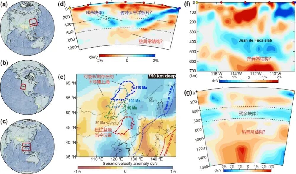 图2. 典型研究区的地幔波速结构。(a)图d的切面位置图。(b)图f的切面位置图。(c)图g的切面位置图。(d)东北亚地幔波速结构切面。(e)东北亚750公里深处的平均波速结构。(f)黄石-斯内克河平原下方的地幔波速结构切面。(g)中国南海下方的地幔波速结构切面。(图片来源:中国科学院广州地球化学研究所)