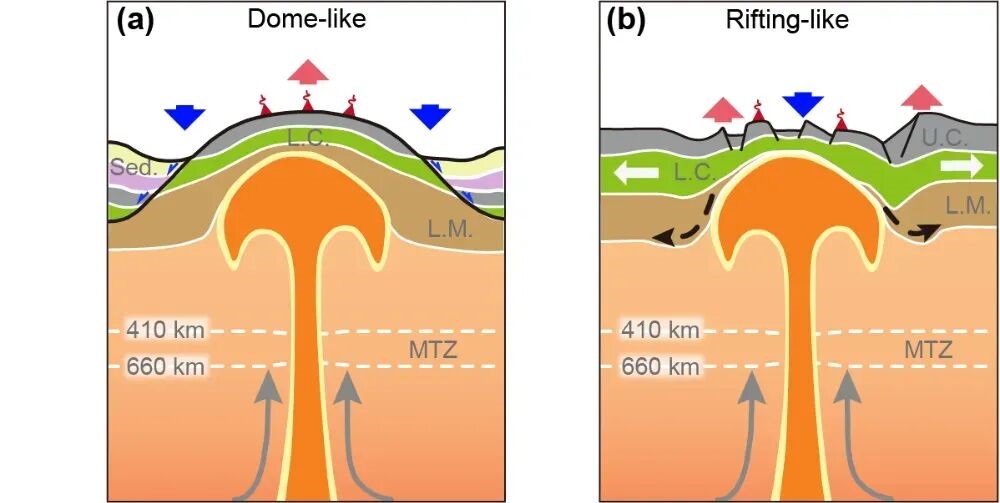 图3. 前人研究揭示地幔柱的地形响应以抬升为主。取决于岩石圈的先存应力状态,地幔柱可以导致地表出现长波长(a)或短波长(b)的抬升。(图片来源:中国科学院广州地球化学研究所)