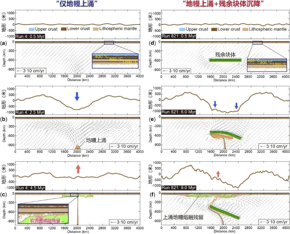 图4. 代表性数值模型结果。(a)-(c)仅地幔上涌的模型。(e)-(f)地幔上涌与沉降残余块体共存的模型。团队测试过的其他动力学演化过程见文章正文。(图片来源:中国科学院广州地球化学研究所)