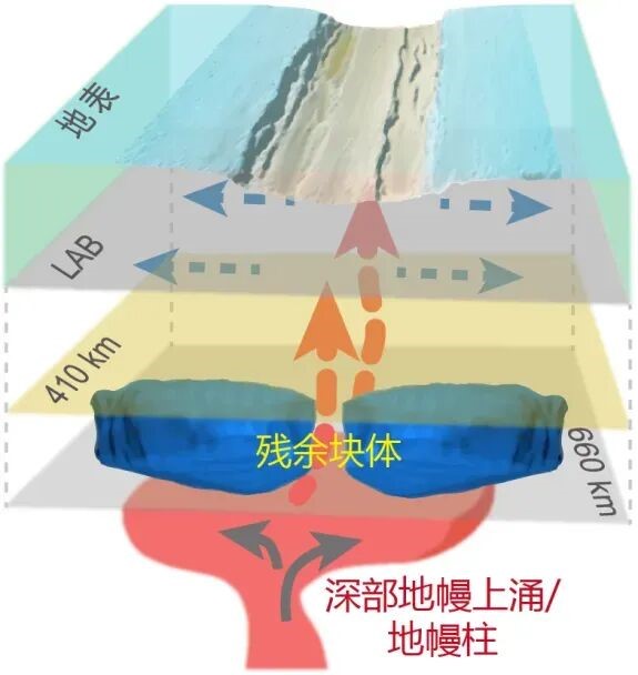 经团队研究发现,在出现过异常沉降区域正下方的深部地幔,都(曾)存在有疑似的下地幔上涌(地幔柱)与地震波高速体共存的现象(此类高波速结构可能代表了俯冲板块或拆沉岩石圈块体,在此统称为“残余块体”)(图2)。