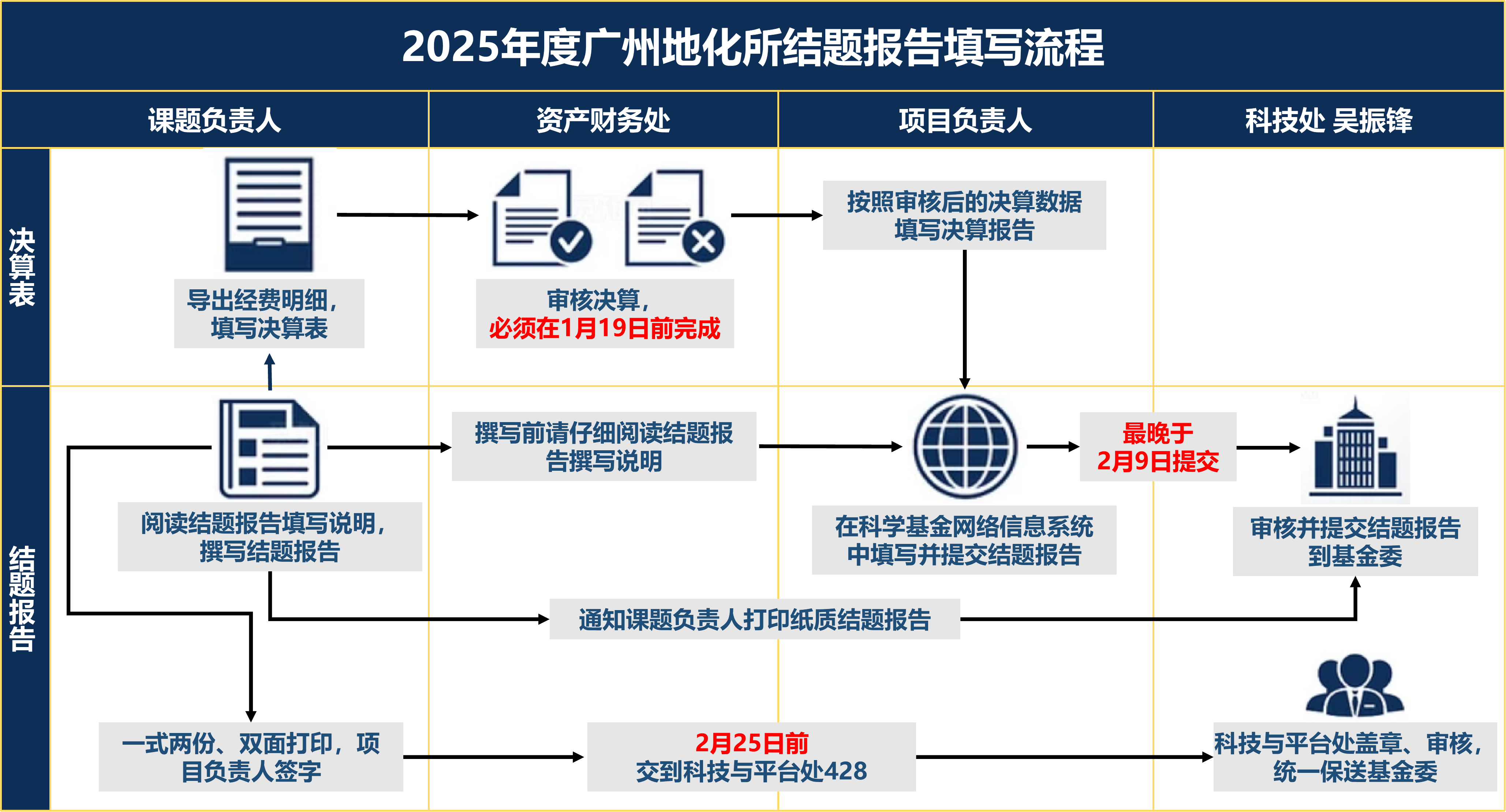 1.项目负责人(1)登录信息系统,(2)撰写结题/成果报告并将附件材料电子化后一并在线提交;(3)待自然科学基金委审核通过后,项目负责人下载并打印最终PDF版本结题/成果报告,(4)向科技处提交签字后的纸质结题/成果报告原件(不含附件材料,签字处填好时间)【一式两份,双面打印】,(5)所章、财务章和科研管理部门章由科技与平台处统一加盖。项目负责人应保证纸质结题/成果报告内容与审核通过后的电子版一致。