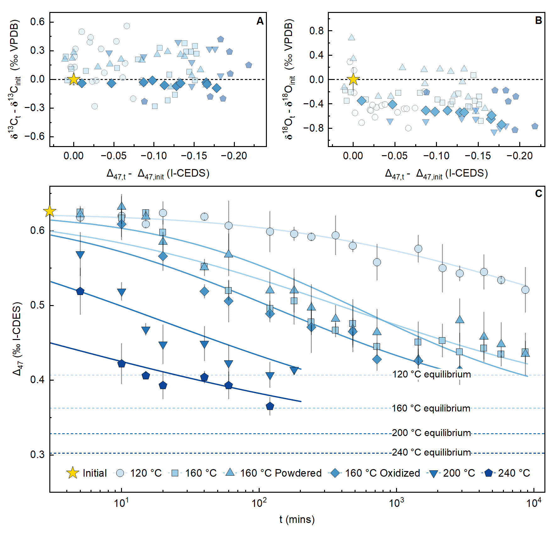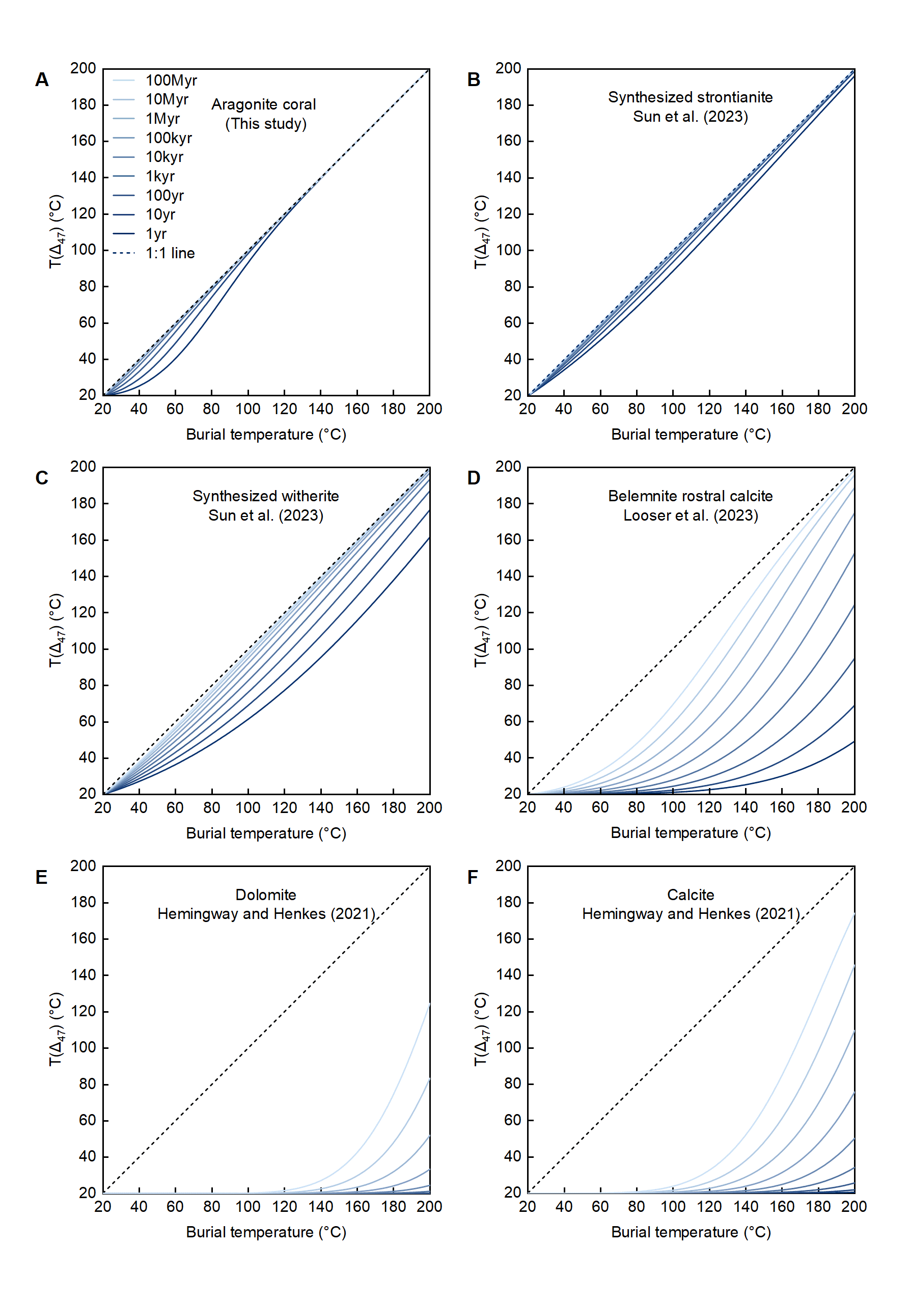 近二十年来,碳酸盐团簇同位素(Δ47)已发展成为古温度重建的重要研究手段。然而,地质时期的碳酸盐,尤其是生物碳酸盐极易受到成岩蚀变作用的影响,导致其Δ47发生重置而偏离初始条件。因此,深入研究碳酸盐在成岩蚀变过程中同位素信号的响应机制显得尤为重要。文石作为海洋生物骨骼的主要矿物成分,在海洋沉积记录中具有广泛代表性;同时,其亚稳态特性使其对埋藏成岩作用极为敏感,这使得研究生物文石在热重置过程中的团簇同位素响应机制具有独特意义。