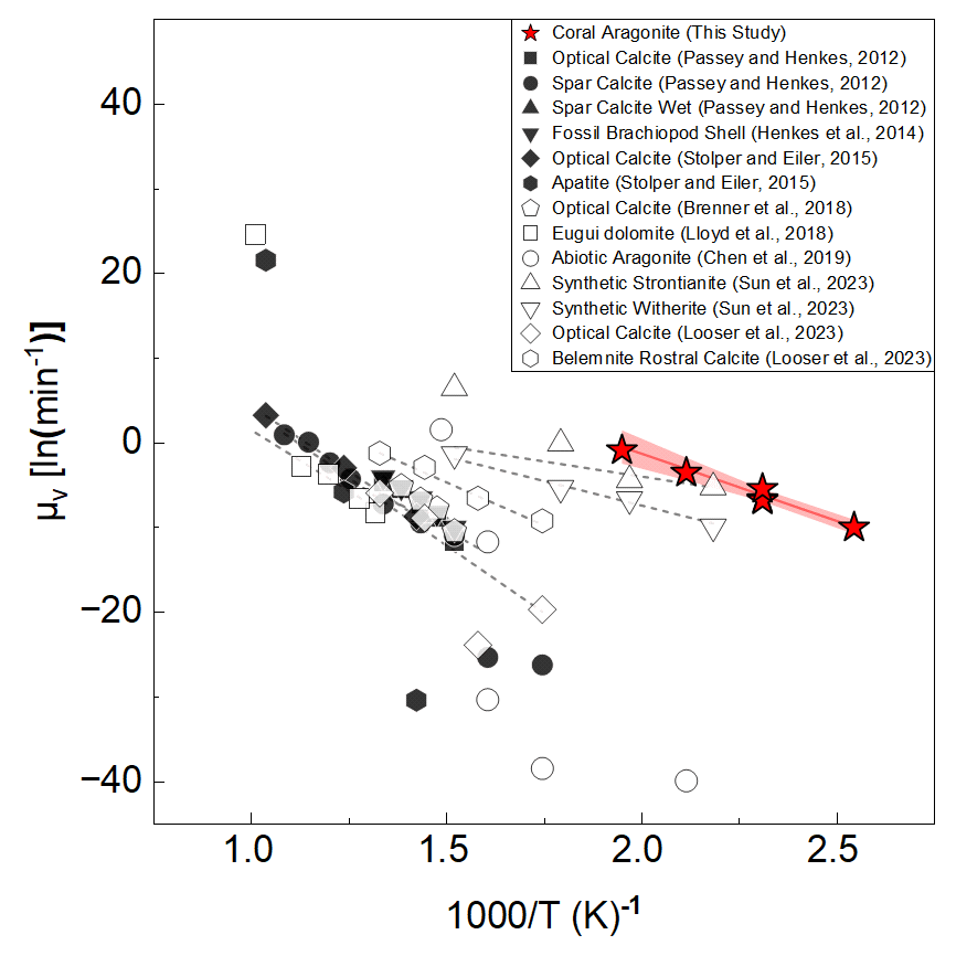 图2. 不同碳酸盐矿物团簇同位素热重置速率的阿伦尼乌斯速率参数图。