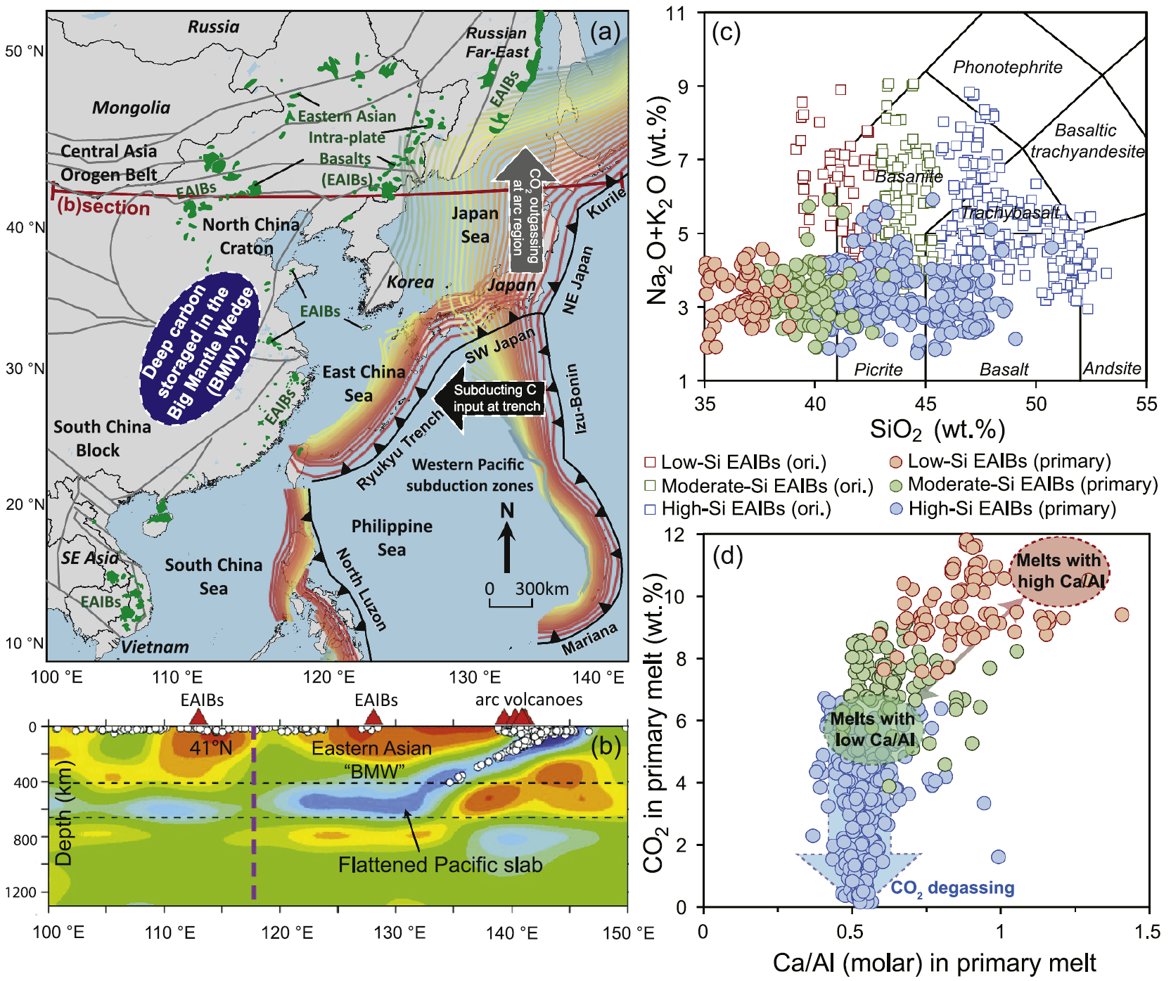 图1:东亚大地幔楔及板内玄武岩(EAIB)原始岩浆碳含量对比