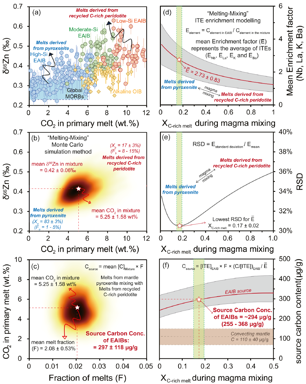 针对以上科学问题,中国科学院广州地球化学研究所博士后杨春在博士导师中国地质大学(北京)刘盛遨教授和博士后导师中国科学院广州地球化学研究所李洪颜研究员共同指导下,收集整合了东亚地区板内玄武岩(EAIB)的主微量元素及Zn同位素数据,并运用基于实验岩石学的熔体CO2 浓度恢复方法,系统计算了EAIB原始岩浆的CO2 含量(图1)。研究发现,EAIB的Zn同位素组成(δ66Zn)与CO2含量、Ca/Al比值等地球化学指标存在显著的相关性,指示EAIB形成于辉石岩熔体与富碳地幔熔体的混合(图2a)。通过构建“先熔融后混合”的蒙特卡洛模型,本研究首次定量估算出东亚大地幔楔的平均碳含量为297±118 µg/g,该值约为正常对流地幔的三倍(图3)。这一结果为东亚大地幔楔是一个规模宏大的碳储库提供了直接证据。