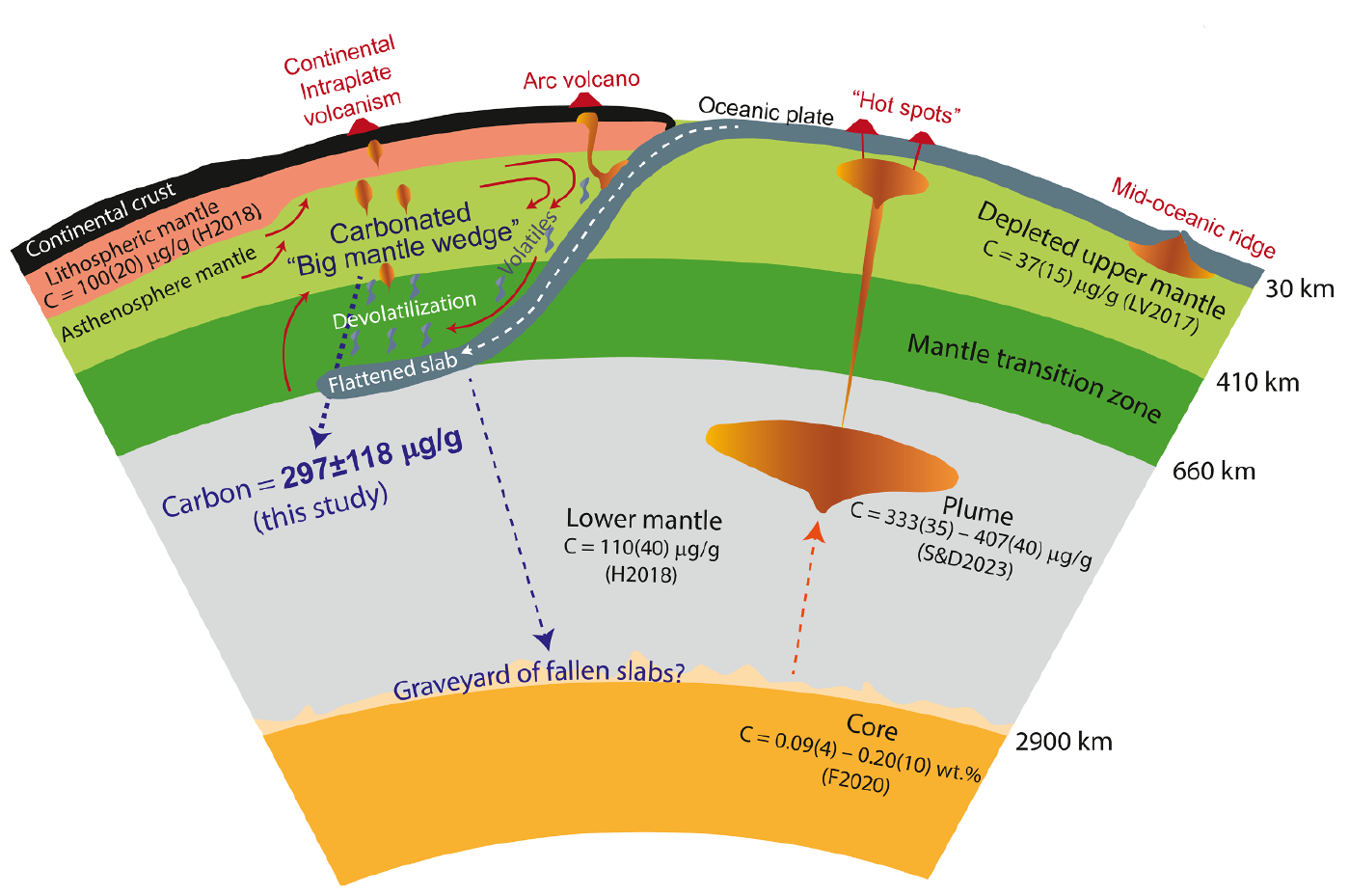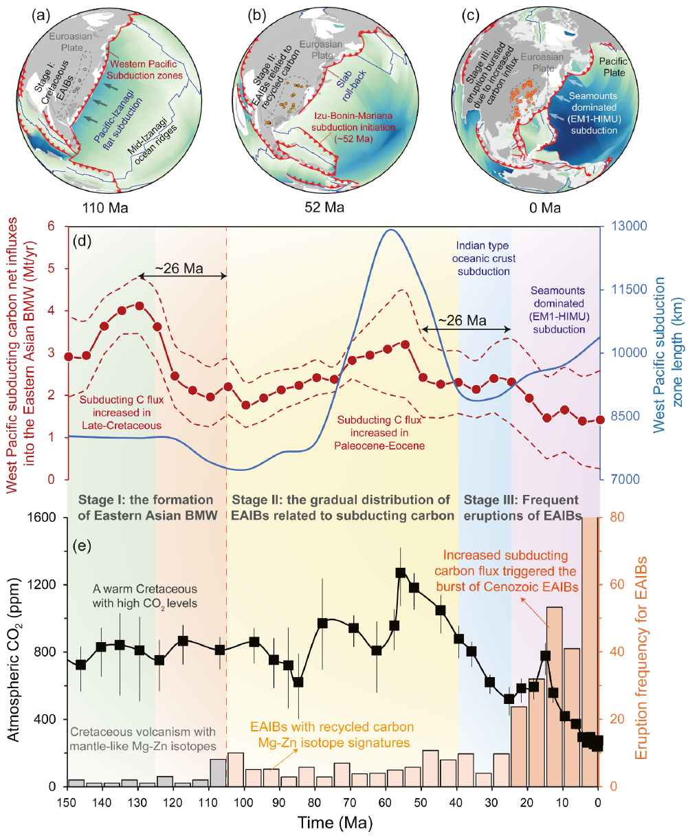 西太平洋板块向东亚大陆深俯冲并滞留在地幔过渡带,形成了规模宏大的东亚大地幔楔。近年来,诸多地球化学示踪及地球物理观测数据均表明,东亚大地幔楔是一个富集再循环碳的深部储库。自白垩纪东亚大地幔楔形成以来,全球气候经历了从“温室”向“冰室”的转变,其背后是大气CO2浓度的长期下降。传统观点强调该时期大陆风化作用增强等表层作用对大气CO2消耗的影响,但古地理重建模型显示,该时期固体地球去气通量的减少对于大气CO2下降的推动作用同样不容小觑。那么,东亚大地幔楔的发育是否影响了大气CO2 浓度并驱动长期气候变化?其碳储库规模及循环通量是破解这一问题的关键,但是一直缺少定量约束。