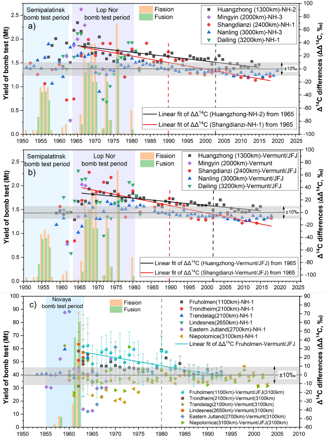 团队还通过系统分析,依次排除了化石源碳排放(1965–1985年间)、核电站、宇生14C、海-气交换和生物源通量等的影响,证实了核试验的地理位置、当量和类型才是1965–1985年间区域14C变化的主导因子。