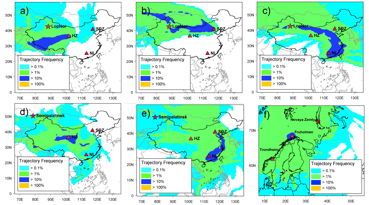 图3 大气气团轨迹频率分布(核试验主要时期)。(a–c) 1966.10.27罗布泊核试验后,湟中(HZ)、上甸子(SDZ)和南岭(NL)站点的气团轨迹频率分布(1966.10.27–1966.11.26)。(d–e) 1957.8.22–1957.9.26苏联塞米巴拉金斯克核试验期间,湟中和南岭的气团轨迹频率分布(1957.8.22–1957.11.19)。(f) 1962.8.5–1962.12.25.新地岛核试验期间,Fruholmen站点的气团轨迹频率分布(1962.8.5–1963.1.1)。