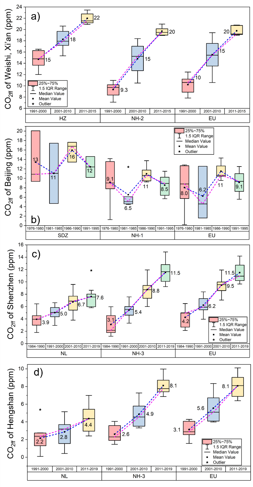 图4 不同背景选择下的估算结CO2ff结果对比。(a–d) 分别展示了在不同背景参考条件下,西安、北京、深圳(本研究)和衡山(本研究)的CO2ff估算结果。蓝色虚线表示平均值的变化趋势,粉色虚线表示中位数的变化趋势。