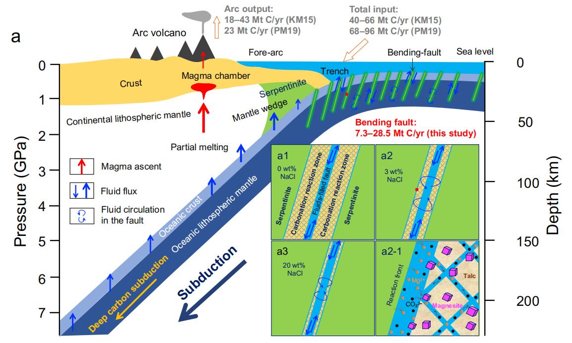 图1. 俯冲板片弯曲断层中的蛇纹石碳酸盐化 (Huang et al., 2024 CMP)