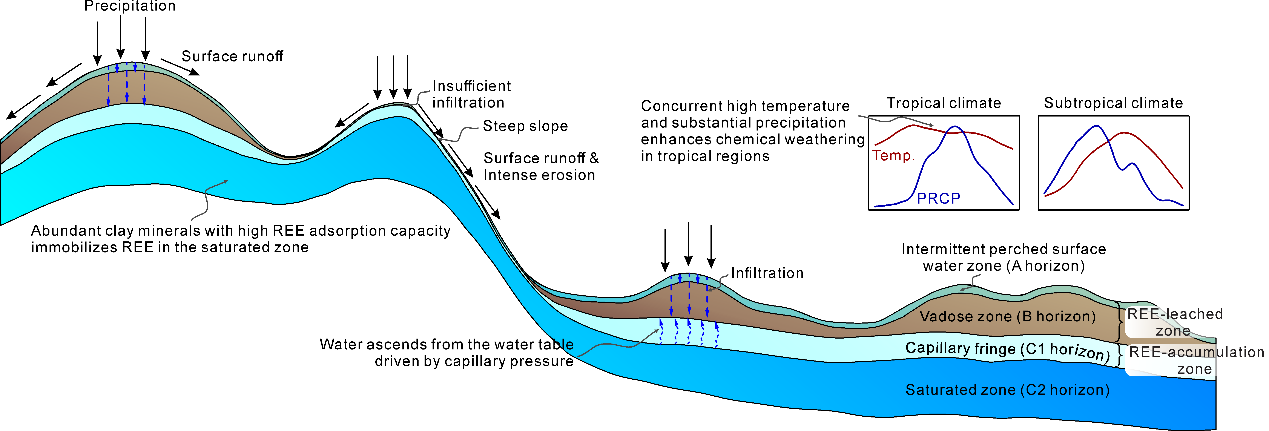 1. 与典型的华南亚热带稀土矿床相比,勐海地区在降雨量充沛和同期的高温气候条件下,形成了风化程度更强烈、风化层厚度更厚的稀土矿床。此外,勐海地区表层活跃的微生物作用促进抗风化稀土矿物(如独居石和磷钇矿)的溶解。茂密的植被覆盖和平缓且均匀分布的地形条件通过降低风化壳表层受到的物理侵蚀强度促进风化壳保存。