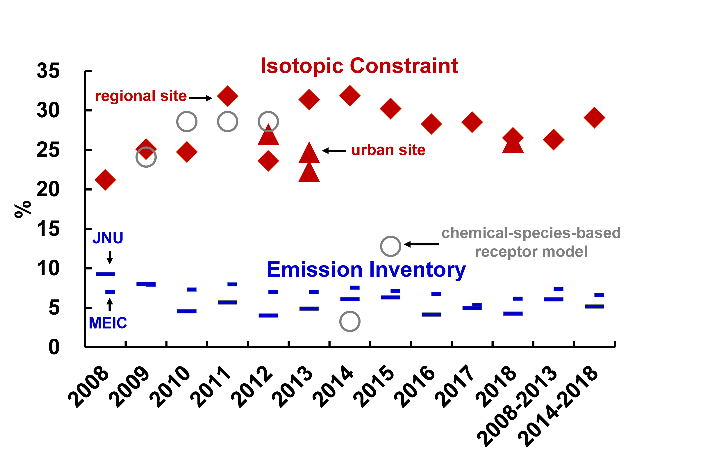 团队进一步对比了2008-2018年“自上而下”的同位素观测结果与“自下而上”的BC排放清单数据,发现两者存在显著的差异。其中,现有排放清单中生物质燃烧对BC的贡献仅为4%至9%,而双碳同位素源解析结果中生物质燃烧对BC的贡献则为21%至32% (图3)。这意味着,当前评估空气质量改善和制定减排策略时所依赖的排放清单,可能在较大程度上低估了生物质燃烧对大气BC的贡献。因此,政策制定者在集中精力于化石燃料燃烧减排的同时,也应及时确定和弥合现有BC排放清单中可能存在的 “盲区”,以保障对生物质燃烧BC排放的进一步精准管控。