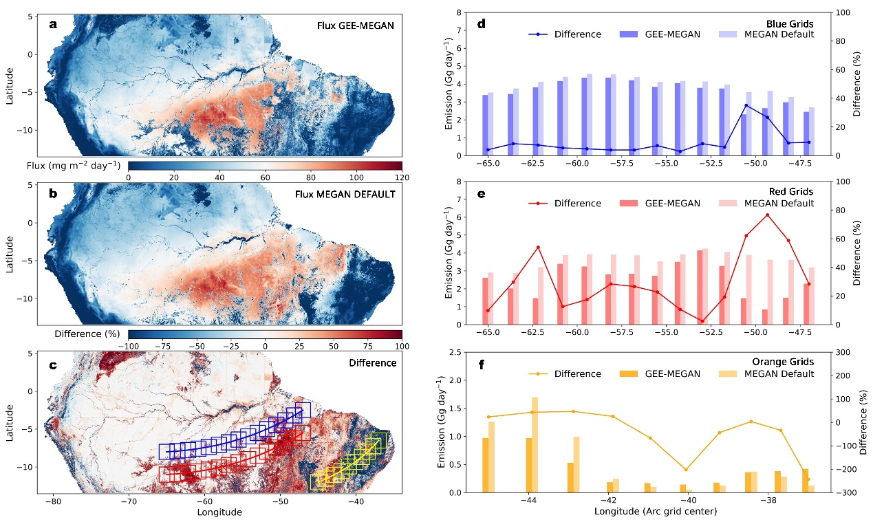 8月28日,由中国科学院广州地球化学研究所王新明研究员团队张艳利研究员和其博士生冉浩汎,与清华大学张强教授团队和加州大学尔湾分校的Alex Guenther教授合作,开发的GEE-MEGAN模型为解决这一难题取得了突破性进展。GEE-MEGAN以其高时空分辨率的BVOCs建模,揭示了关键区域与以往传统BVOCs模型估算的巨大差异 (全球主要城市差异高达~25倍、在亚马逊毁林弧相差约80%)。该研究成果以“Improved modelling of biogenic emissions in human-disturbed forest edges and urban areas”为题发表在《Nature Communications》 期刊。