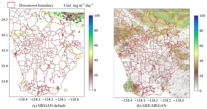 图5. 洛杉矶GEE-MEGAN与传统MEGAN模拟BVOCs排放空间分布对比