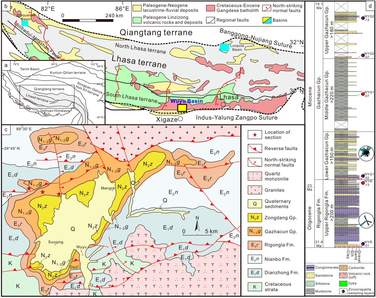 针对这一问题,中国科学院广州地球化学研究所博士后薛尔堃等联合爱尔兰都柏林圣三一大学David Chew教授,聚焦冈底斯地区的乌郁盆地(图1),对盆地内渐新世‒中新世地层(约31-15 Ma)进行系统的碎屑锆石‒磷灰石沉积物源分析,通过古水系重建揭示了南拉萨地块渐新世-中新世时期的地形变化,为冈底斯弧的隆升过程提供了新的限定。