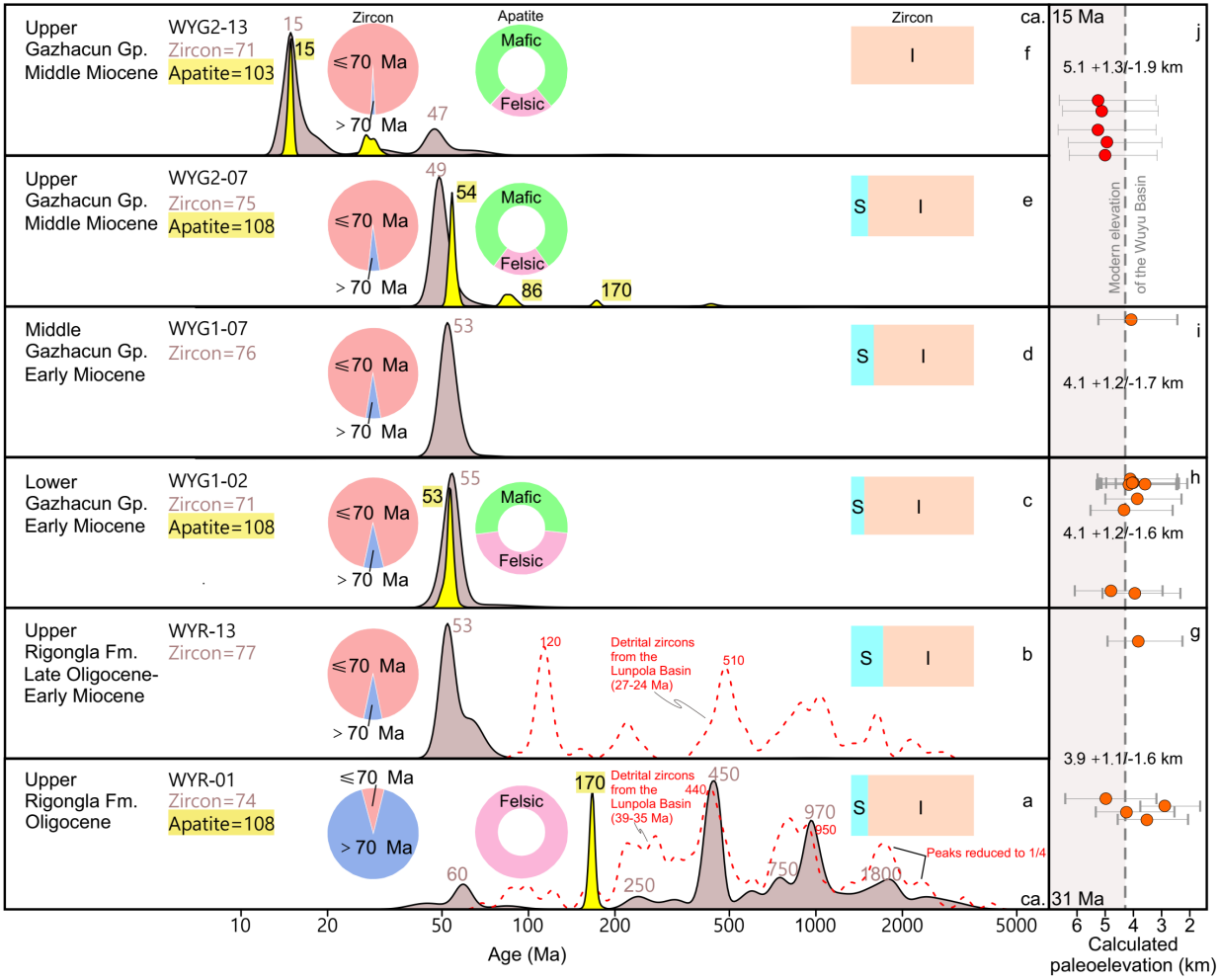 图2 乌郁盆地渐新世-中新世地层碎屑锆石和磷灰石年龄和源岩特征,以及前人古高程数据