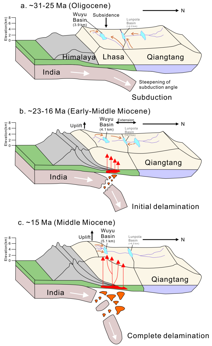 渐新世时期(不晚于31 Ma),由于拉萨地壳下印度岩石圈俯冲角度变陡而产生拖拽,导致冈底斯弧发生沉降,使其地势较低,得以接受外部的碎屑物质。之后由于印度岩石圈开始拆沉,拖拽的力量减弱,冈底斯开始逐渐隆升。15 Ma因印度岩石圈完全拆沉,导致软流圈上涌和加速隆升。
