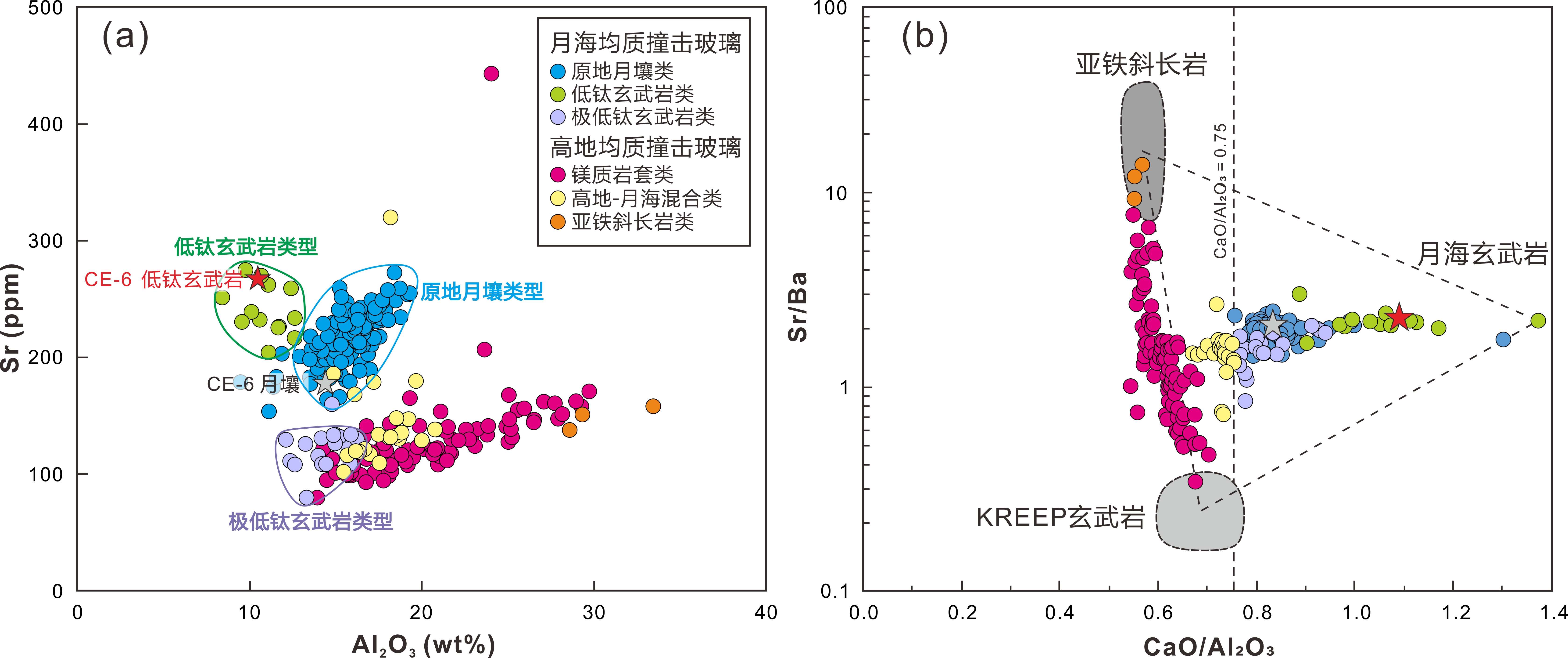 (2)撞击玻璃在形态上分为均质(干净)和非均质(含未完全熔融矿物或岩屑等)两类,其中绝大多数(94 num%, 95 vol%)非均质玻璃都为原地撞击而成,而近半数(45 num%, 56 vol%)均质玻璃具有外来特征(图2)。除了碎屑长石中识别出的三种外来组分外,玻璃中还含有KREEP(富K,P和REE等不相容元素)和高地-月海混合类型组分(图3)。