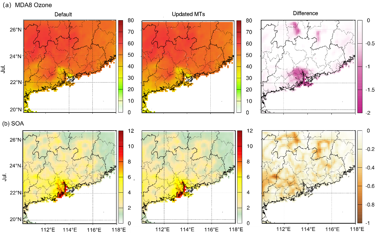 结果显示,改进后的算法使我国华南地区单萜排放量冬季减幅高达60%,夏季减幅约达9%(图1a);降低了臭氧模拟值与观测值的平均标准化偏差(MNB),使模拟与观测的差值降低了9-19%(图1b);华南地区夏季臭氧的日最大8小时平均浓度(MDA8 O₃)相应下降约3%–7%(最高减少2 ppb),二次有机气溶胶(SOA)浓度下降10%–24%(最高减少1.2 μg/m³)(图2)。引起该变化的原因,主要是大气氧化能力(AOC)的降低以及单萜烯氧化生成SOA途径的转变(图3)。
