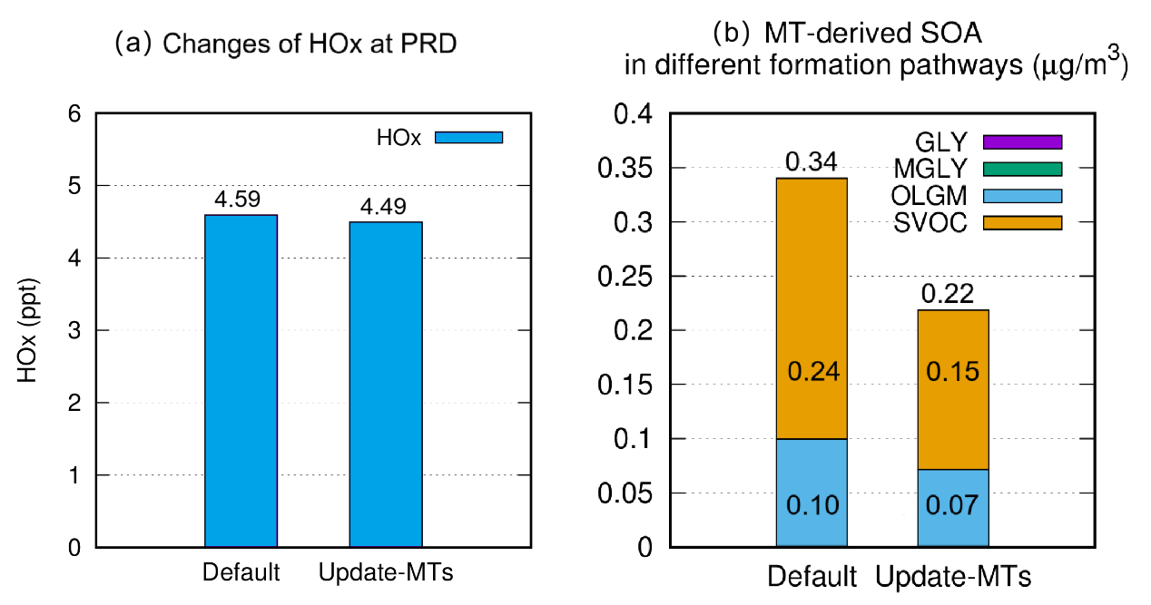 图3 算法更新前(Default)和后(Updated MTs),夏季珠三角地区 (a)大气氧化性与 (b)不同SOA生成途径[半挥发性产物(SVOC)、低聚物(OLGM)、乙二醛(GLY)和甲基乙二醛(MGLY)]的变化