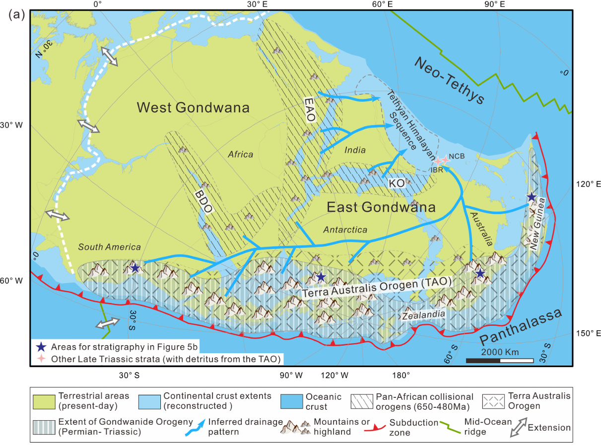 图1、晚三叠世冈瓦纳大陆水系格局重建图。