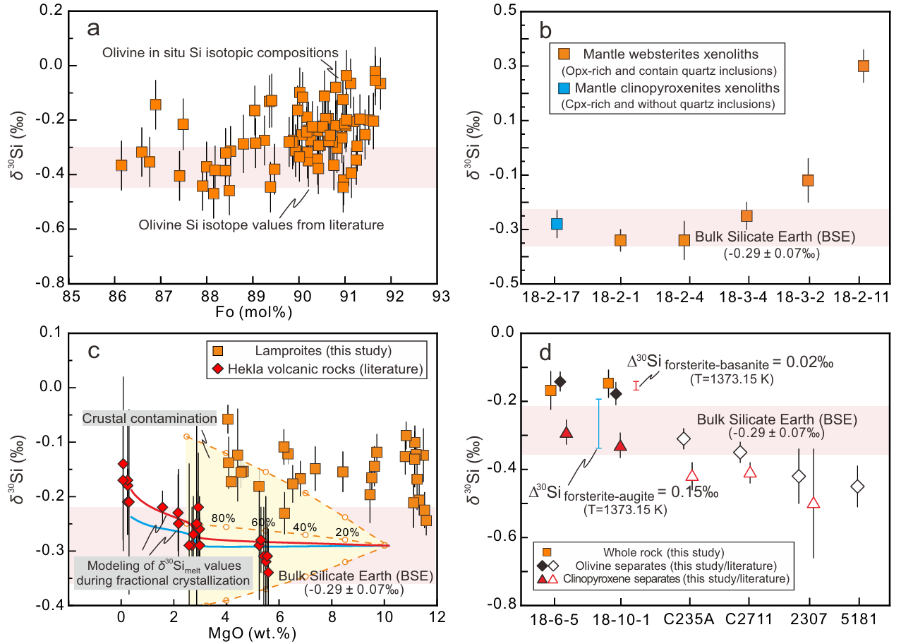 近日,中国科学院广州地球化学研究所王强研究员团队在National Science Review(《国家科学评论》, NSR)在线发表题为“Discovery of a heavy silicon isotope mantle reservoir”的研究论文。该研究系统地报道了来自喜马拉雅-青藏造山带碰撞后钾镁煌斑岩和伴生地幔辉石岩捕虏体的全岩和矿物原位硅同位素数据,结果显示出独特的重硅同位素特征,为地球深部存在重硅同位素储库提供了新证据。综合岩石地球化学分析与同位素分馏模拟,团队提出这种重硅同位素储库的形成与俯冲印度大陆板片熔体引起的地幔交代作用有关。