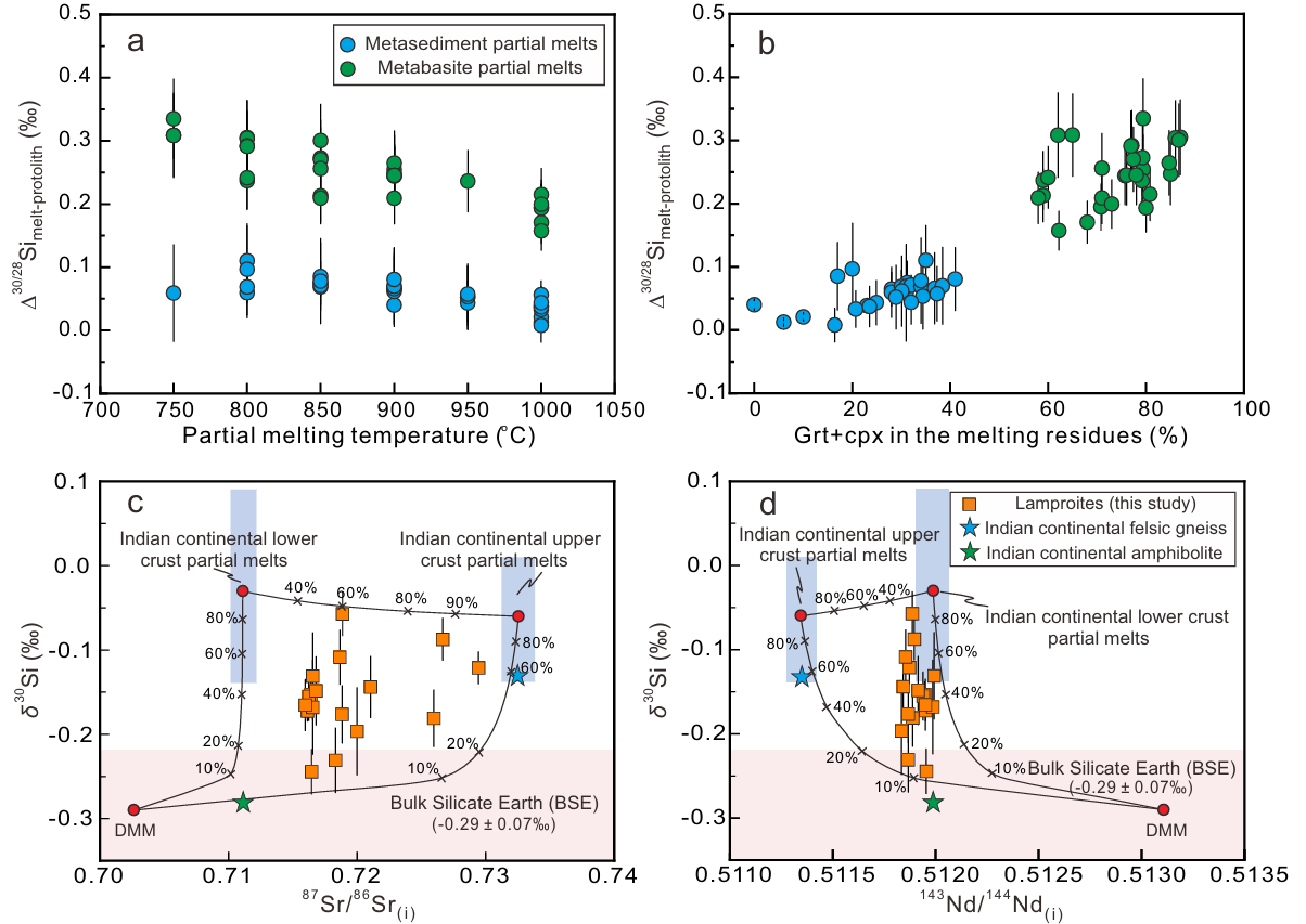 喜马拉雅-青藏造山带出露大量新生代幔源超钾质岩石,这类岩石源于富集地幔的低程度部分熔融,往往反映了地幔源区的不均一性,是研究上述问题的理想对象。研究团队选择喜马拉雅-青藏造山带碰撞后钾镁煌斑岩和伴生地幔辉石岩捕虏体作为研究对象,通过系统的全岩与微区硅同位素分析,取得了以下认识:(1)拉萨地体中新世钾镁煌斑岩及其地幔包体的硅同位素值显著重于BSE,是目前国际上报道的硅同位素最偏重的地幔岩石(图1);(2)钾镁煌斑岩的重硅同位素组成并非由壳内演化过程(例如地表风化、壳内分离结晶及地壳混染)所致,而是直接继承自其地幔源区(图2);(3)板片熔融过程会发生显著的Si同位素分馏,残留相(如石榴子石+单斜辉石)富集轻硅同位素,而熔体则富集重硅同位素(图3)。结合前人已发表的资料,重硅同位素储库的形成可能与俯冲印度大陆板片熔体引起的地幔交代作用有关。