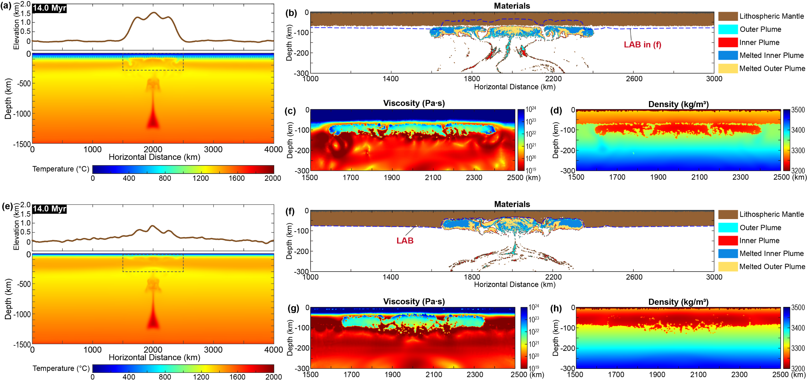 综上,本研究不仅为理解地幔柱导致的热点隆起规模提供了新视角,也为探索地幔柱的深部动力学演化过程及其浅表响应开辟了新思路。通过综合天然观测数据与数值模拟结果,研究揭示了地幔柱导致岩石圈物质再分布的浅表响应形式,强调了大洋成分岩石圈对地幔柱上涌和地幔熔融的关键制约作用。研究进一步表明,地幔柱在大洋板块下方的活动频率可能高于以往认识,且其影响范围可能更为广泛。