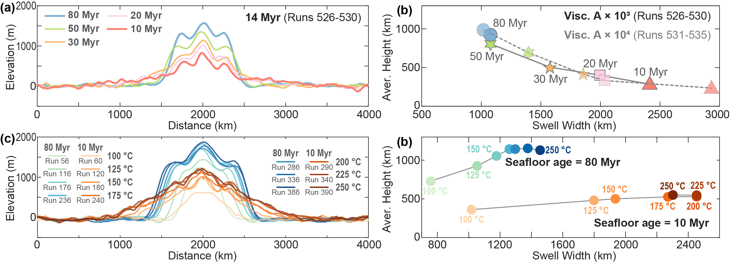 为了总结洋底热点隆起的特征,研究团队参考已有的洋底热点目录,统计了其宽度和平均高度(移除洋底冷却沉降效应之后)(图2)。通过分析发现,位于>50 Ma洋底的热点隆起倾向于呈现狭窄且高耸的形态,而位于<20 Ma洋底的热点隆起则主要表现为宽阔且低矮的形态。此外,在靠近洋中脊的区域,热点隆起会沿着与中脊平行的方向延伸,导致长轴上的高度/宽度小于短轴。这些观测结果表明,普通的热点隆起与更宽阔的超级隆起分别倾向于在古老和年轻的大洋板块上发育。