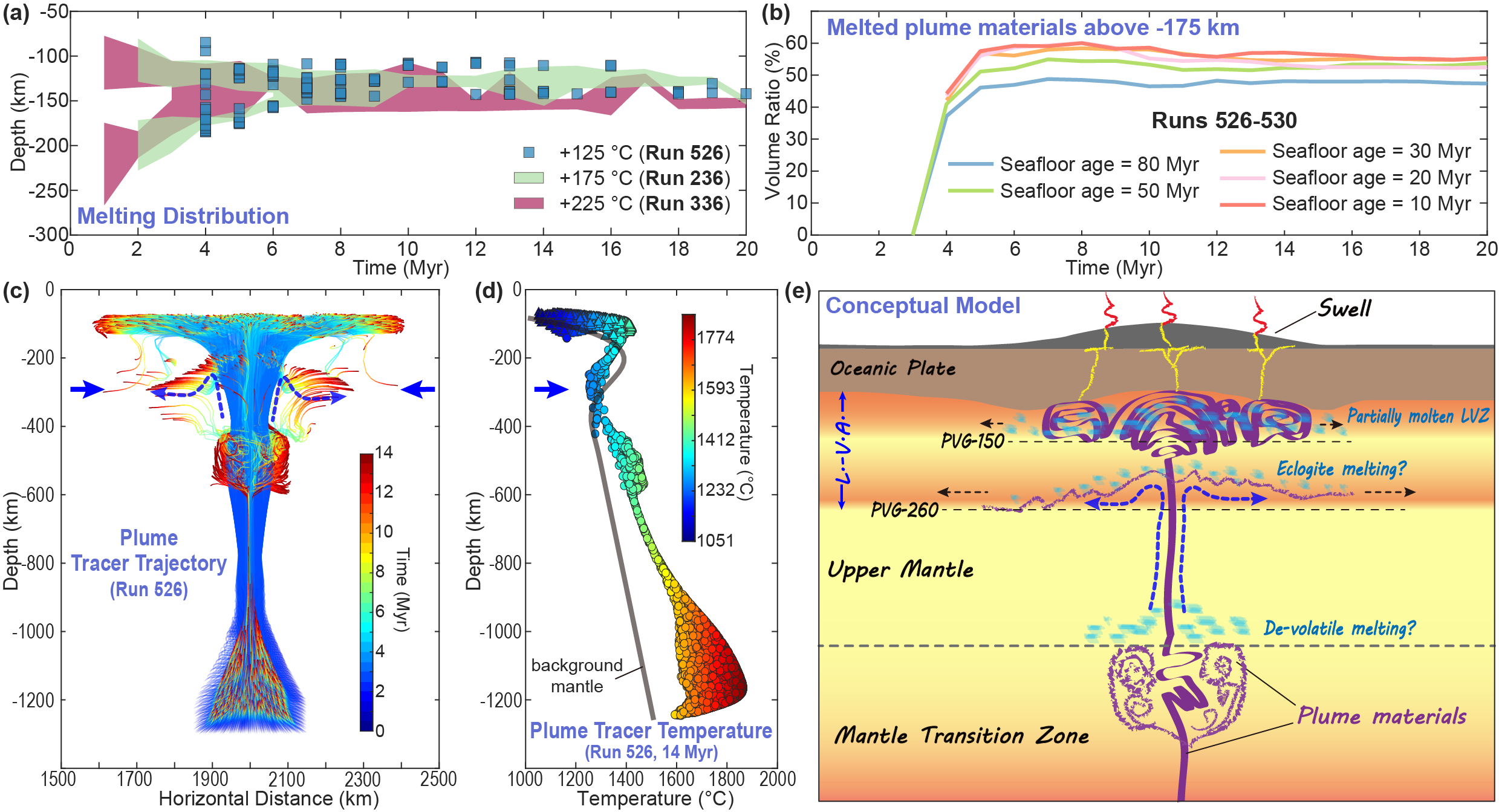 图5. 模型中地幔柱的熔融行为(a-b)、物质运移(c)、温度演化(d)、纵向结构(e)等结果的汇总