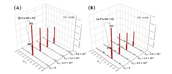 图1 (A)石竹烯和(B) α-蒎烯生成的α-HH暴露于不同浓度乙胺的信号强度