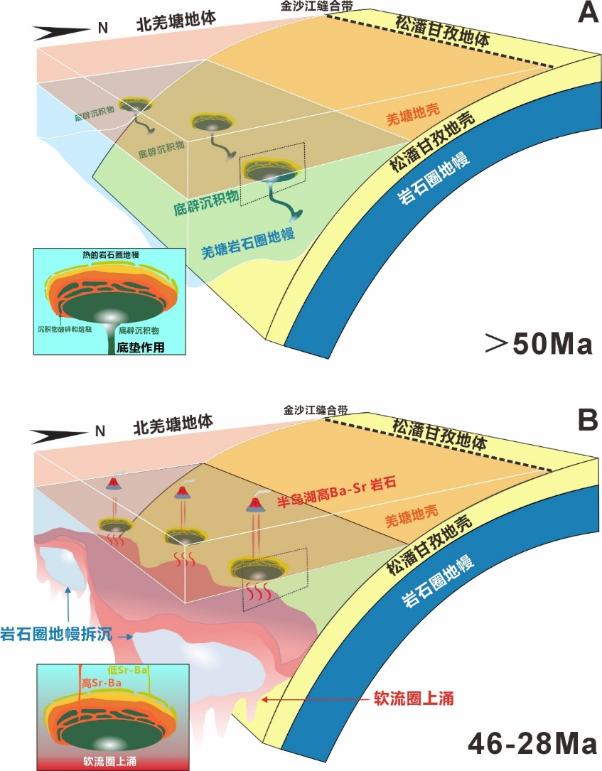 在此基础上,研究提出了一个两阶段地球动力学模型:首先,陆内俯冲使松潘–甘孜沉积物底垫到羌塘岩石圈底部,并对上覆地幔发生强烈交代,形成超富集地幔域;随后,岩石圈减薄和软流圈上涌触发这些富集地幔发生部分熔融,最终形成始新世高Ba–Sr岩浆(图3)。该模型将沉积物输入、地幔富集与岩浆演化统一到同一动力学框架之中。