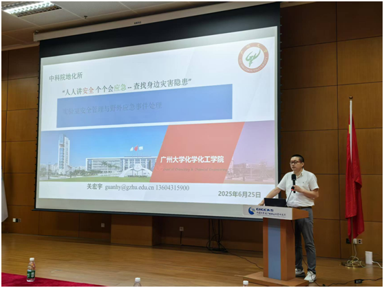活动伊始,广州大学化学与化工学院教授关宏宇首先作《实验室安全管理与野外应急事件处理》报告。关宏宇以多起真实实验室事故案例为切入点,深入浅出地剖析了实验室安全管理的关键要点。并且从实验室安全基础知识讲起,详细介绍了实验室潜在的各类危险源,着重强调了危化品采购、储存及废弃物处理的规范流程。此外,关宏宇结合自身丰富的野外科考经验,分享了在野外遭遇突发情况时的应急处理办法,如野外迷路、生病等状况下的自救与互救技巧,为参训职工、研究生拓展了应急知识的边界。