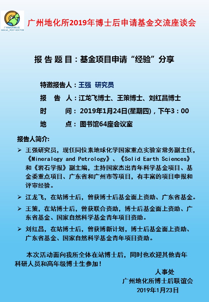 2019年度博士后创新人才支持计划、第65批中国博士后科学基金面上资助和第12批特别资助项目等基金申报工作已启动,为做好相关基金的申报工作,进一步提高获资助率,人事处和所博士后联谊会决定开展博士后基金申请经验交流会,特邀王强研究员和已获各类资助的相关资深博士后做经验分享和现场交流。现就有关事宜通知如下: