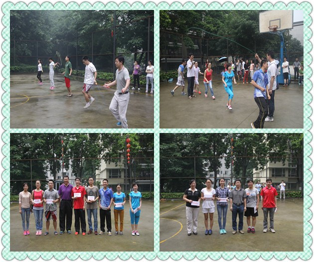 本次跳绳比赛,设单人、团体两个项目。单人赛制为“1分钟跳绳”比赛。经过激烈角逐,研究生曾令君独占鳌头,勇夺第一名,梁鹤、胡永斌、欧林、杨愿愿(第五)、马金龙(第五)、何良英、吴蕾分别摘取前8名。