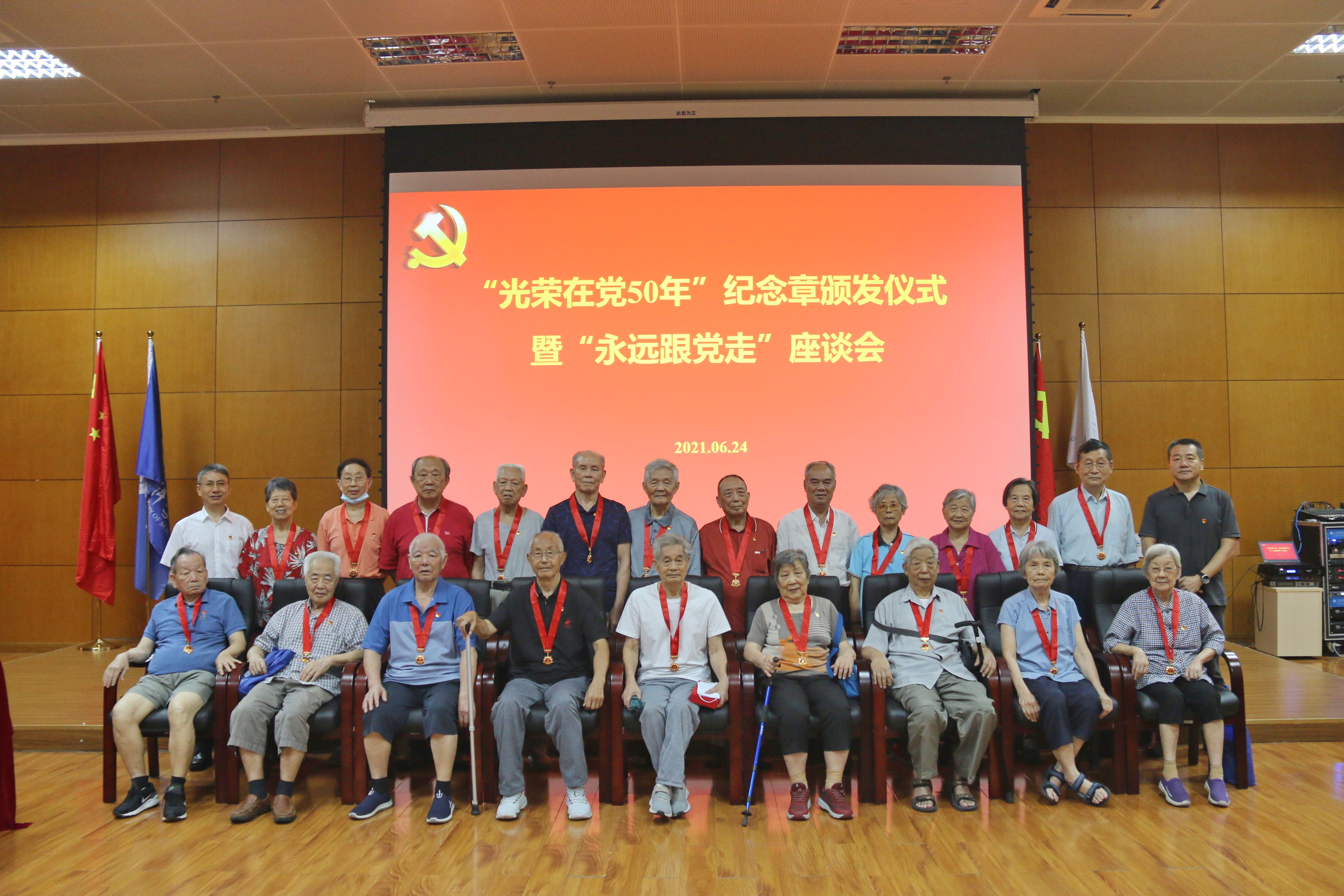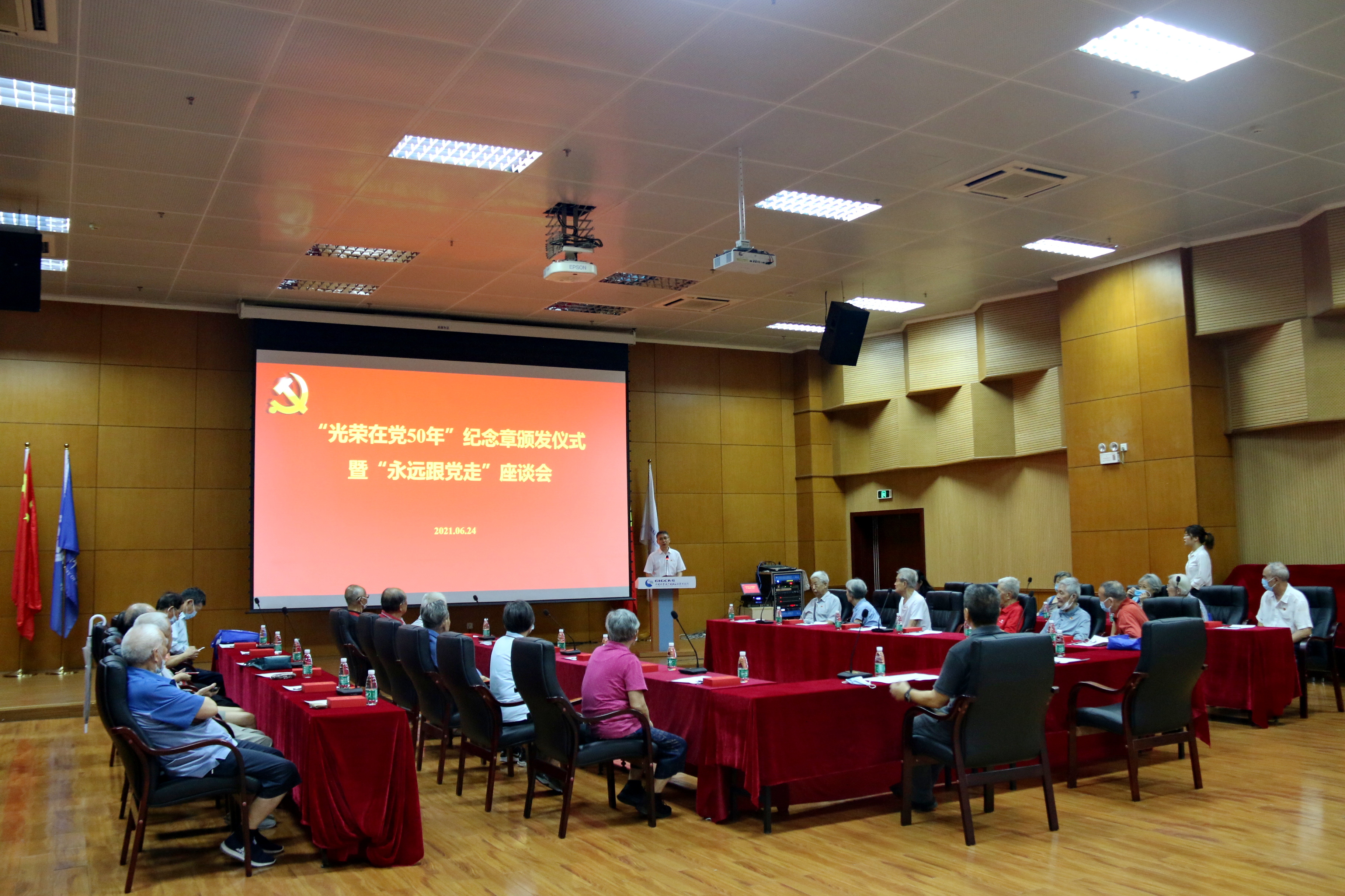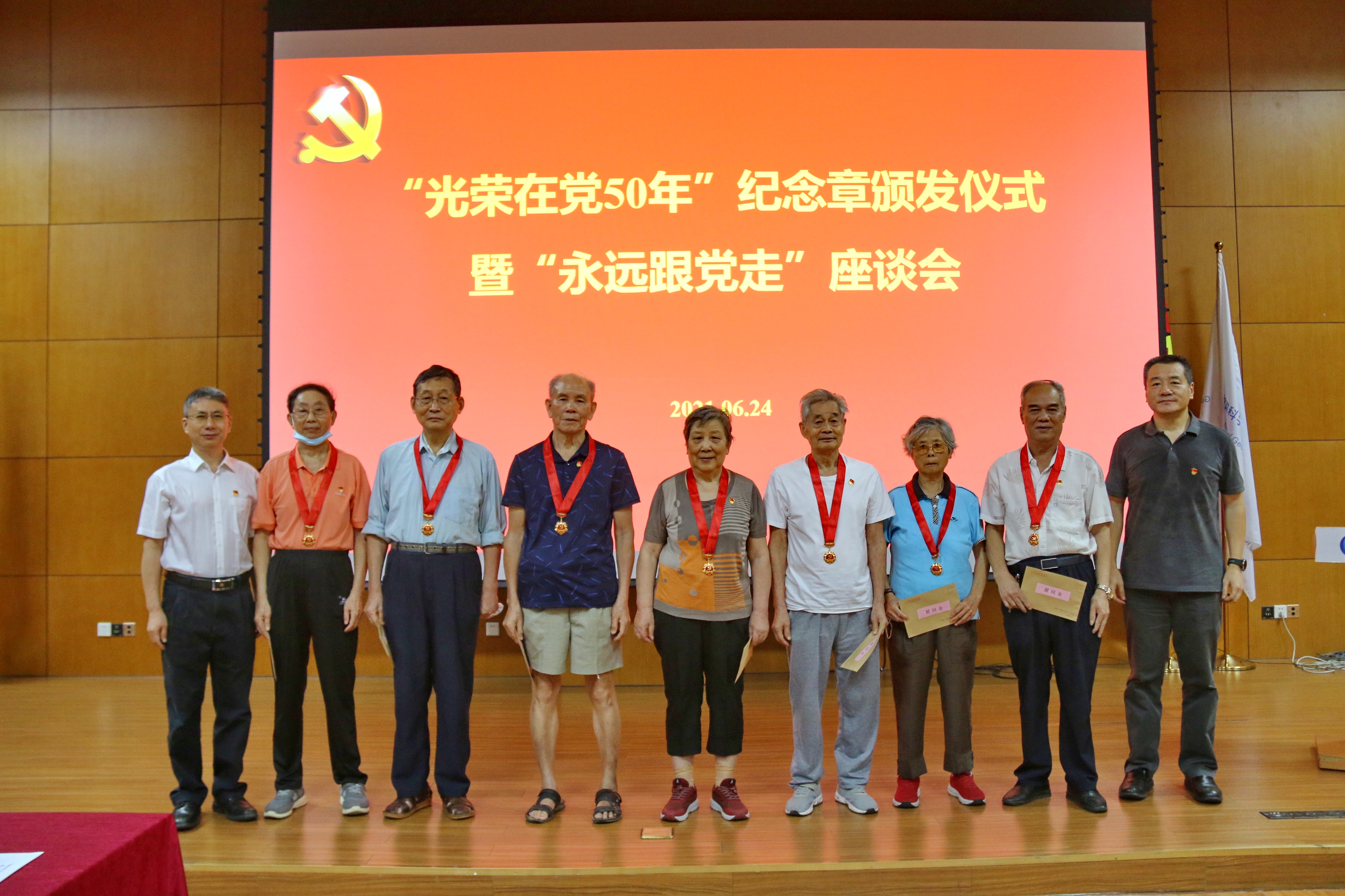 在中国共产党建党100周年来临之际,6月24日上午,中国科学院广州地球化学研究所召开“光荣在党50年”纪念章颁发仪式暨“永远跟党走”座谈会,副所长、党委委员张海祥,党委副书记、纪委书记李海滨以及22位“光荣在党50年”老党员代表等出席座谈会。