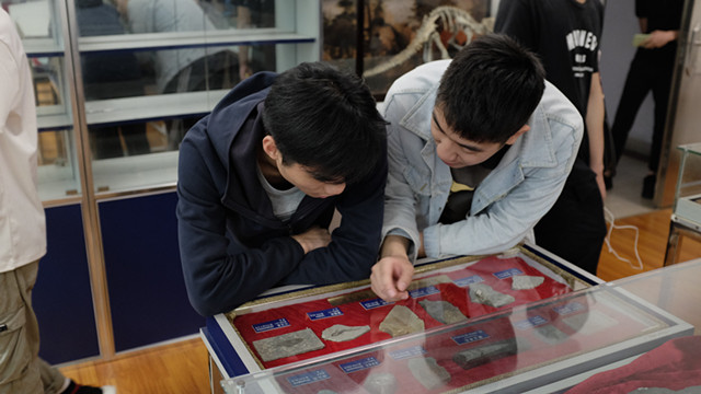 在老科学家和研究生志愿者的引导下,同学们开始了“基础地质课程之旅”。展柜里900余种形态各异的岩石矿物和古生物标本,引得大家不时驻足学习。2位讲解员分组对照馆内各种模型,为同学们讲解了丹霞地貌、喀斯特地貌、火山和地震等自然景观的形成原理和过程,同时结合同学们所学专业,对有关代表性的岩石和矿物的结构、构造以及在工程地质中的应用等地学知识进行了详细讲解。在矿物展区,同学们了解了玛瑙、玉石、石笋的结构组成及其形成原理,以及人造水晶和天然水晶的区别特征;在古生物展区,面对各种虫、鸟、鱼化石、恐龙蛋化石等古生物标本,同学们产生了浓厚的兴趣,不断向讲解员提出疑惑和见解,如三叶虫如何辨别雌雄、恐龙蛋如何保存等问题。