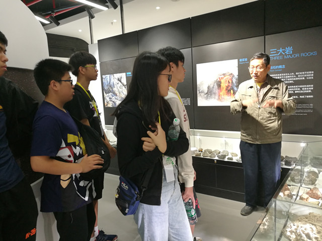 师生们首先抵达科普陈列馆。在老科学家讲解员的引领下,同学们先后参观了“宇宙诞生与元素形成”、“地球的圈层结构与板块”、“地球内外动力与三大岩”、“金属与非金属矿产”、“古生物化石与黄土”、“野外地质考察体验区”、“室内显微镜操作区”、“煤炭与化石能源”、“环境污染与保护”等多个展区。各展区生动活泼的图文展板、丰富多彩的标本,加上讲解员通俗易懂的解说,让孩子们在方寸之间便从时间和空间两个尺度系统而全面地学习了宇宙、地球及人类的历史与现状。在“广州地化所发展史”展区,师生们了解了广州地化所的历史沿革及研究方向,并以此为案例体会中国科学院的科研任务与使命。
