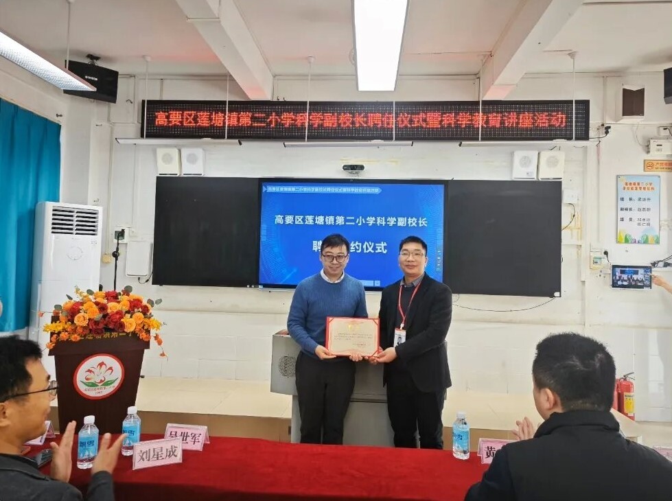在热烈的氛围中,莲塘镇第二小学隆重聘任中国科学院广州地球化学研究所刘星成研究员为科学副校长。一纸聘书,不仅是一份荣誉,更是一份责任,标志着高校科研资源与基础教育实践实现深度对接,为学校科学教育注入鲜活的专业力量。刘星成研究员表示很荣幸受聘为科学副校长,将充分发挥自身科研与科普经验,助力学生科学素养提升,推动学校科学教育高质量发展。