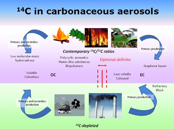 图:不同成因碳质气溶胶有机碳(OC)与元素碳(EC)的14C组成与演化