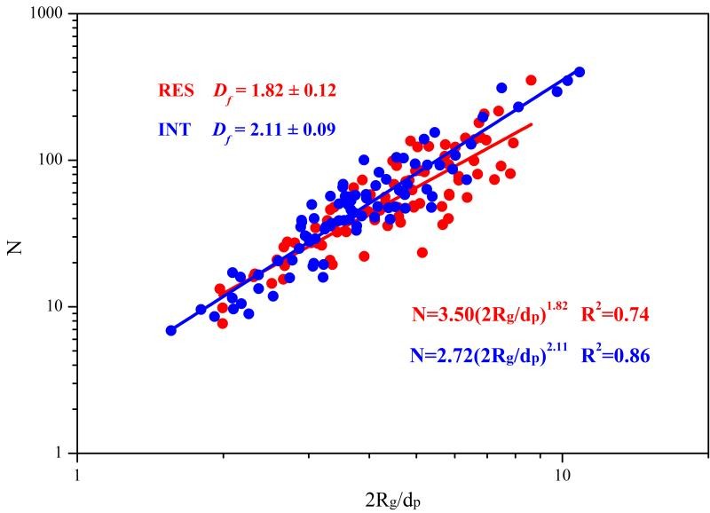 图2:云滴残留颗粒(RES)和间隙颗粒(INT)中黑碳的分形维数