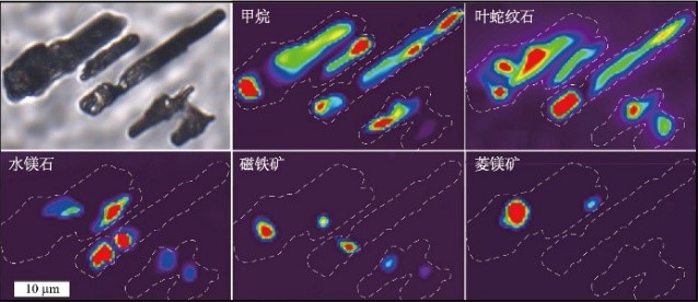 玉石沟方辉橄榄岩中第一类流体包裹体为长柱状定向排列于橄榄石内部的原生流体包裹体,其由甲烷、叶蛇纹石、水镁石、磁铁矿和菱镁矿等组成(图1)。这类包裹体记录了相对高温下橄榄石直接蚀变为叶蛇纹石、水镁石和磁铁矿的过程,对目前认为高温叶蛇纹石化不能产生磁铁矿、生成氢气并合成甲烷的经典观点提出了质疑。第二类沿着裂隙分布的次生流体包裹体主要由甲烷、氮气、利蛇纹石、水镁石和磁铁矿等组成(图2),而且捕获流体的硅含量控制了蛇纹石化时水镁石的生成及相应的甲烷产量。第三类次生流体包裹体和第二类流体包裹体分布类似,但是其主要由甲烷、叶蛇纹石、磁铁矿、石墨和碳酸盐(菱镁矿和白云石)等组成(图3),捕获流体高的CO2含量促进了叶蛇纹石的稳定。而且第三类包裹体中残留利蛇纹石的出现表明高CO2条件下的蛇纹石化是一个两阶段过程,即橄榄石先蚀变为亚稳定利蛇纹石,然后转变为稳定叶蛇纹石。这也解释了类似条件下实验模拟和天然样品中分别生成利/纤蛇纹石和叶蛇纹石的差异可能是由动力学因素所控制的。