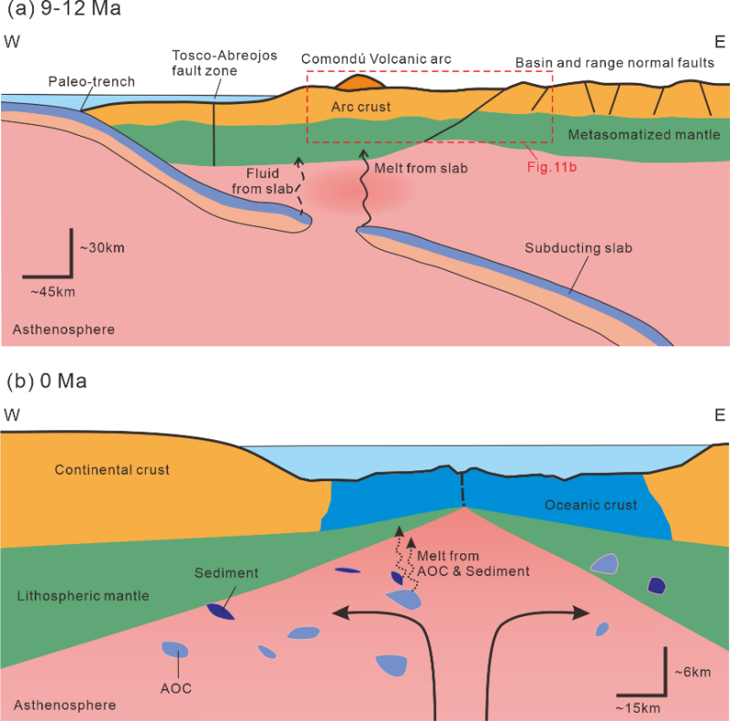 对比加利福尼亚湾从北到南第四纪近乎同期的岩石样品,本研究发现,从加利福尼亚湾北部(如Isla San Luis火山)?中部(瓜伊马斯盆地)?南部海湾开口处(如Alarc n盆地),岩浆岩呈现出地球化学富集程度(富集Ba元素,亏损Nb、Ti元素)逐渐减弱的变化趋势(图3a),且Ba/Nb及Th/Nb不断降低(图3b),表明加利福尼亚湾的拉张从南到北是渐进式的,且随着加利福尼亚湾的逐渐拉张,新生洋盆地幔源区中富集的再循环组分也逐渐地被耗尽。