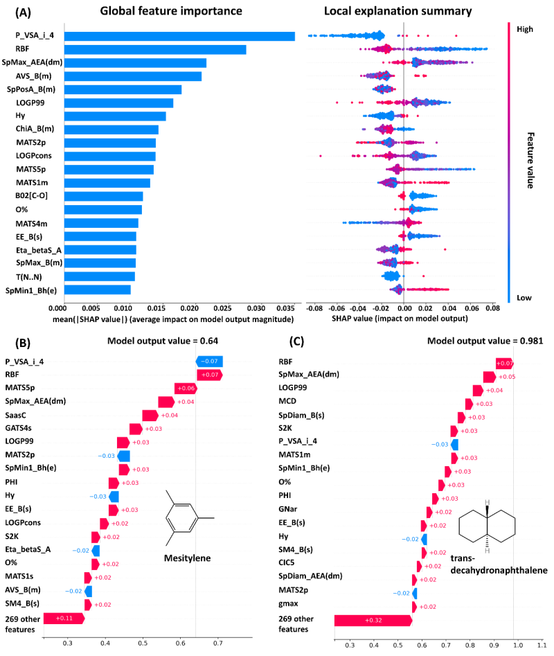 图3. 基于SHAP方法对模型预测结果 (A) 模型解释全局解释图,(B) 1,3,5-三甲基苯的模型解释瀑布图,(C) 反式十氢化萘的模型解释瀑布图