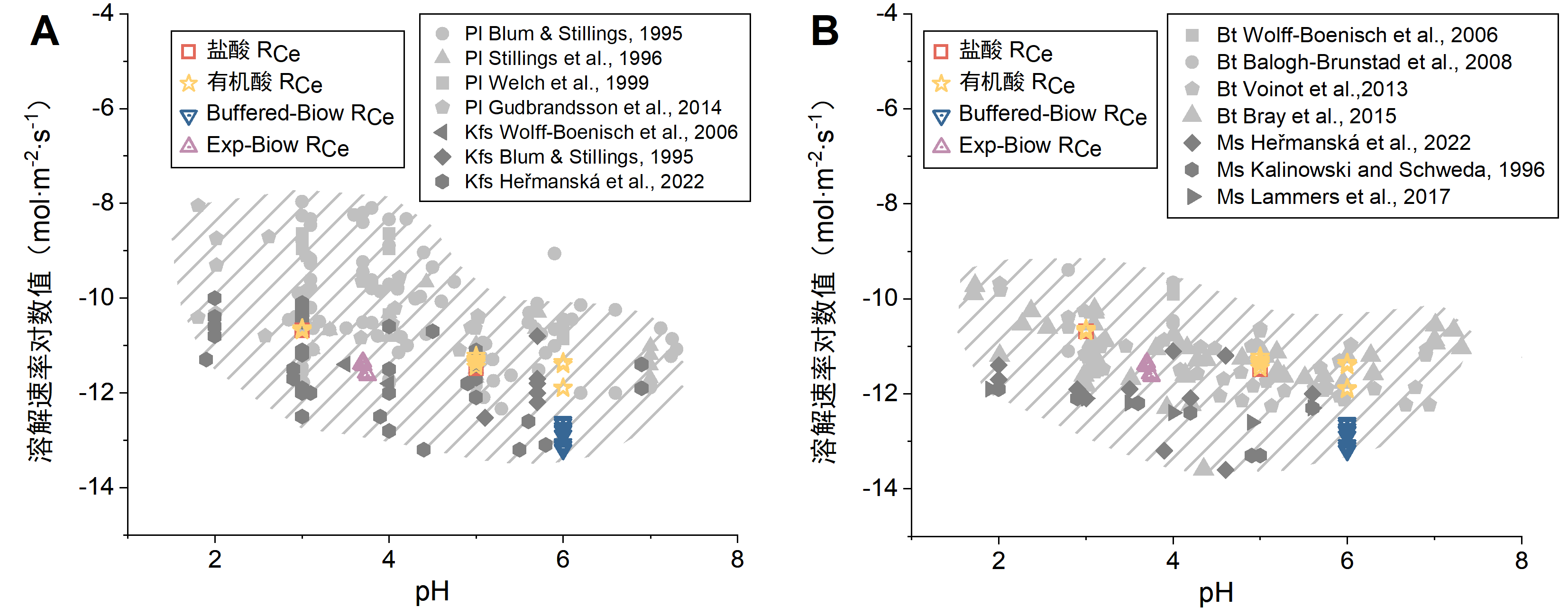 图1 本研究中氟碳铈矿的溶解速率(以RCe表示)与前人研究在相似条件下测定的(A)斜长石(Pl)和钾长石(Kfs)、(B)黑云母(Bt)和白云母(Ms)的溶解速率(以RSi表示)。Buffered-biow RCe是指恒定pH = 6条件下的微生物风化实验中测得的Ce释放速率。同时将本研究中未添加缓冲剂的微生物风化实验(Exp-Biow)中稳定酸性条件下(pH ~3.7)第8至30天Ce的释放速率以及无菌化学溶解实验中的Ce释放速率置于图中以作比较.