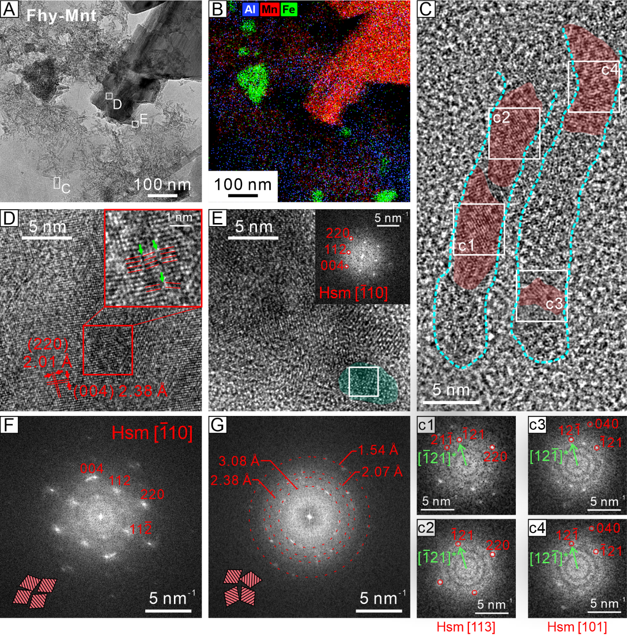 图 3水铁矿-蒙脱石体系(Fhy-Mnt)产物微观结构特征:(A)TEM图;(B)元素分布图;图A中不同选区的HRTEM图,显示MnOx产物具有颗粒组装结构:(C)MnOx纳米纤维、(D)块状MnOx、(E)MnOx纳米纤维-块状MnOx交界处;(F、G、c1-c4)对应图D全局、图E全局、图C选区的FFT图。